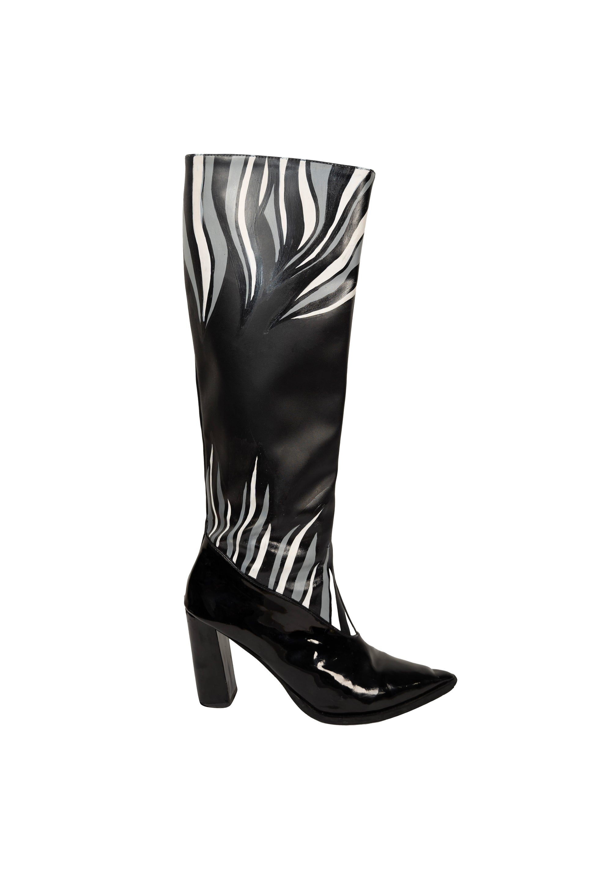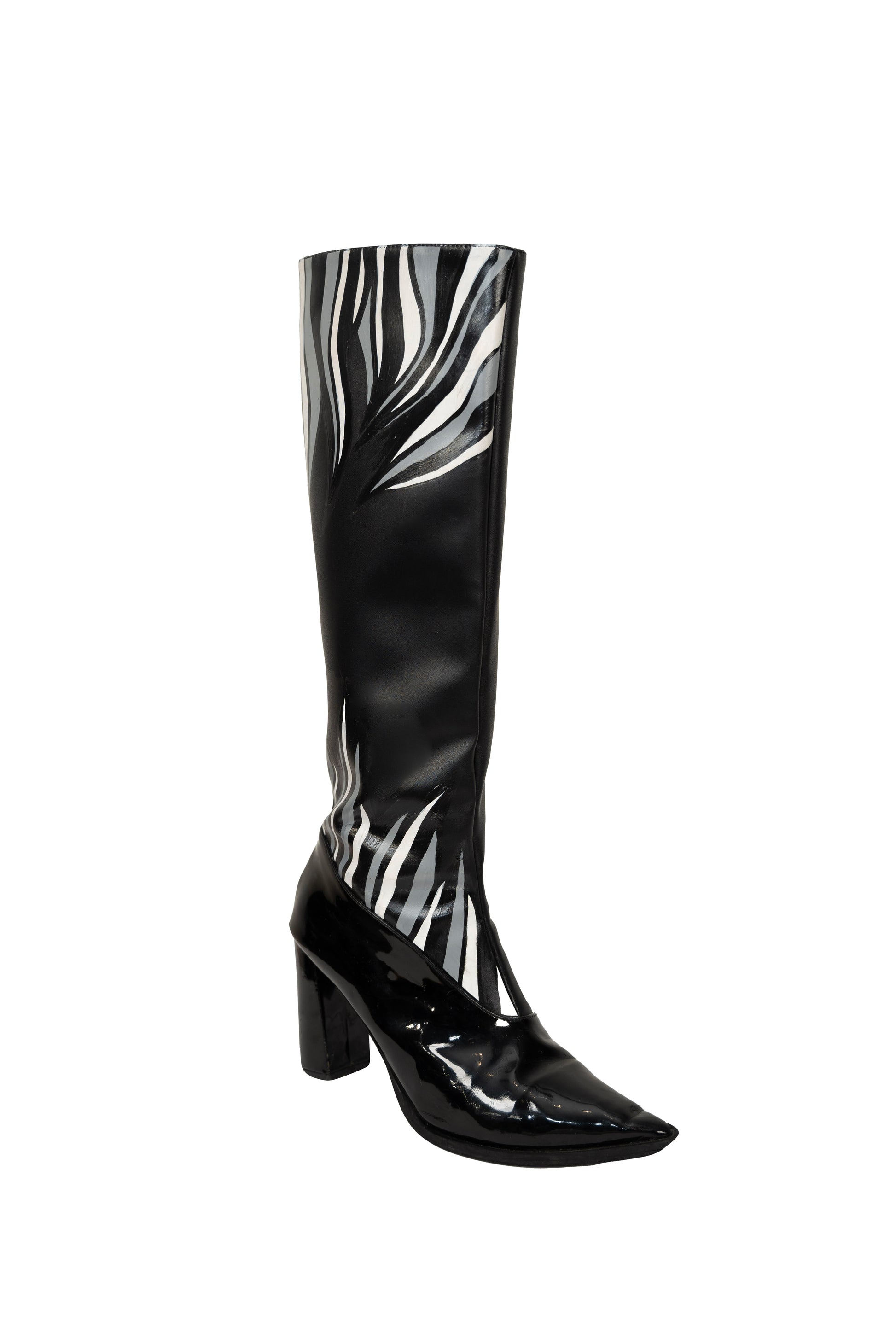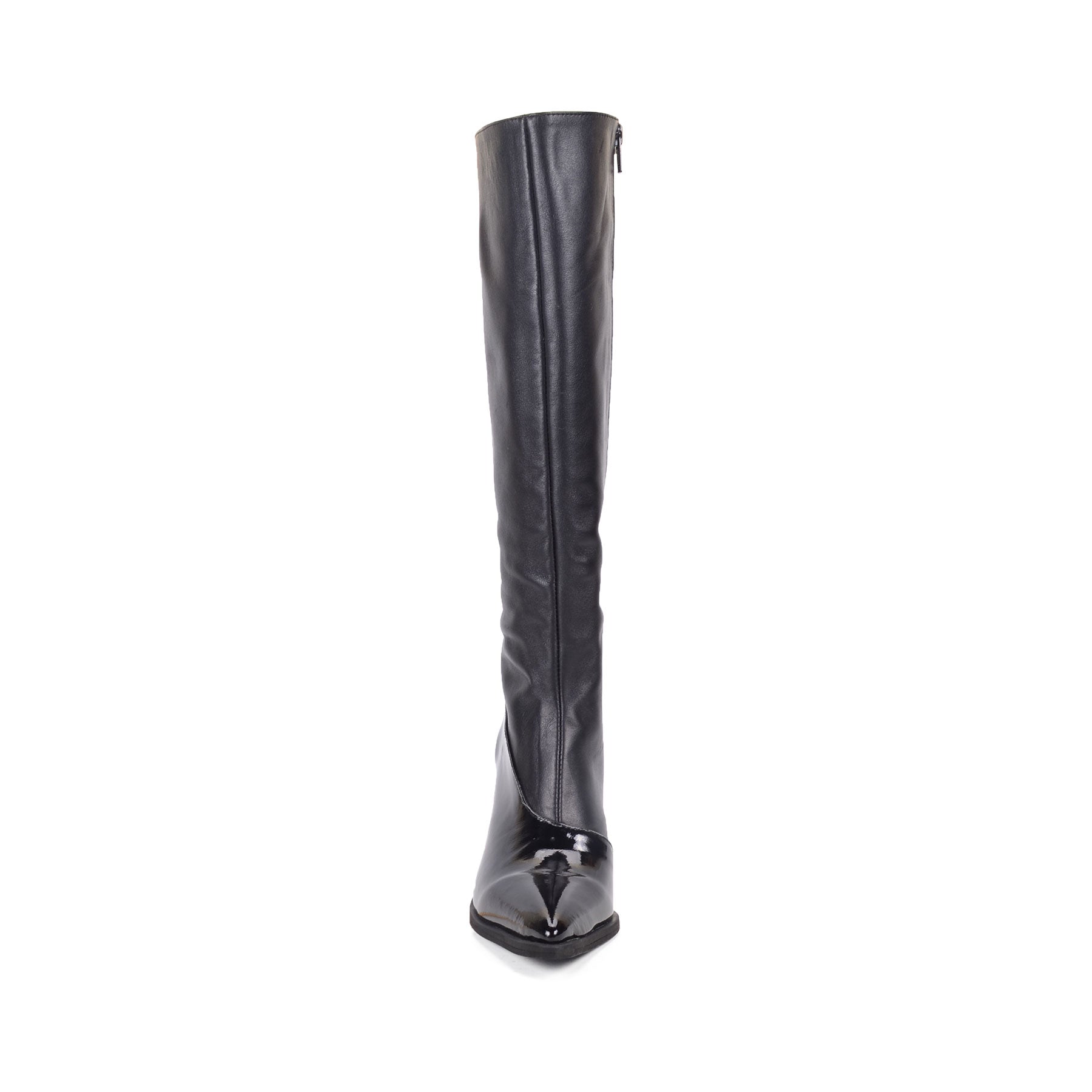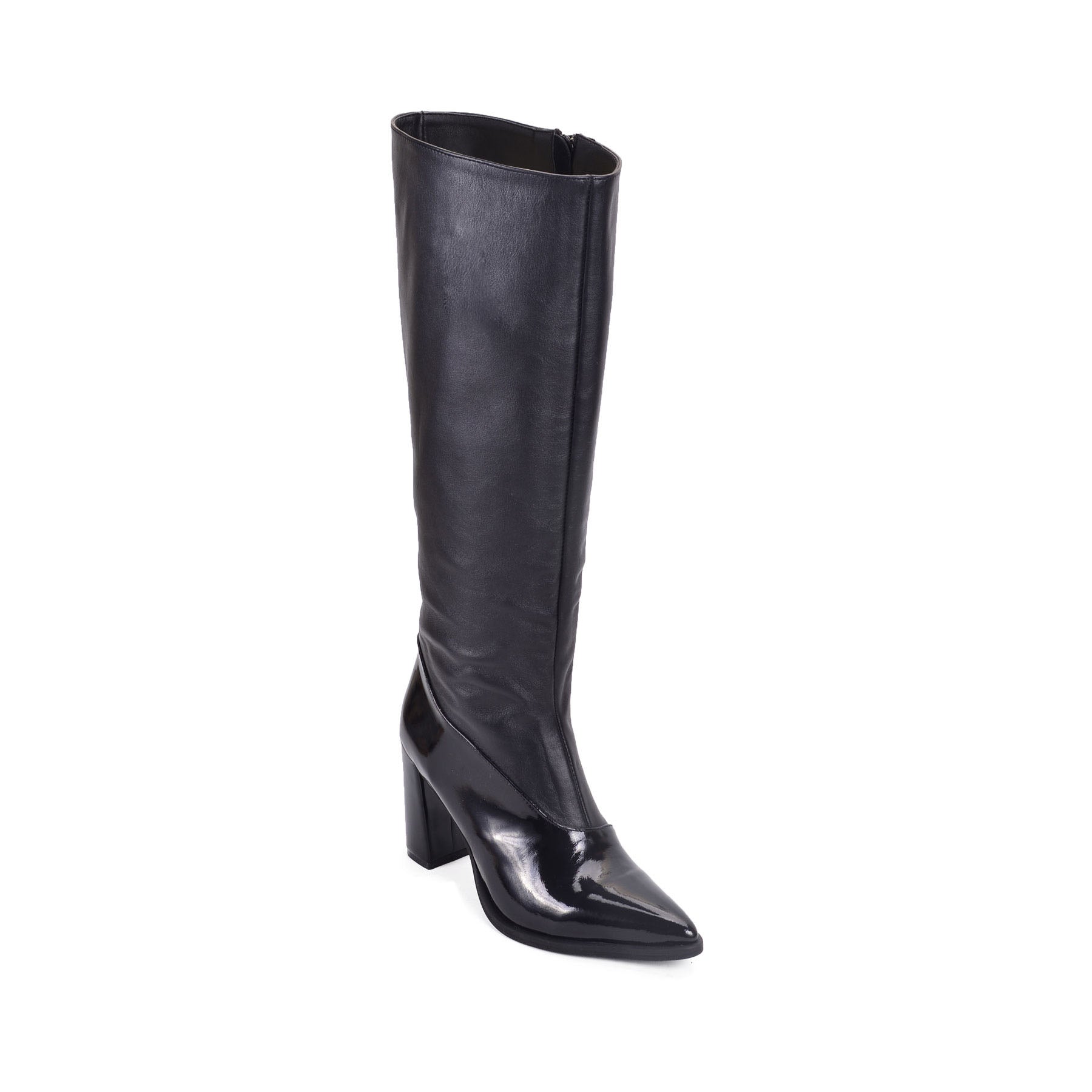 The Ada black knee-high boots are perfect for winter, spring, summer or fall evenings. Made from smooth vegan leather and patent accents, they feature a pointed toe and block heel. Pair them with a mini skirt or dress for a chic, standout look.