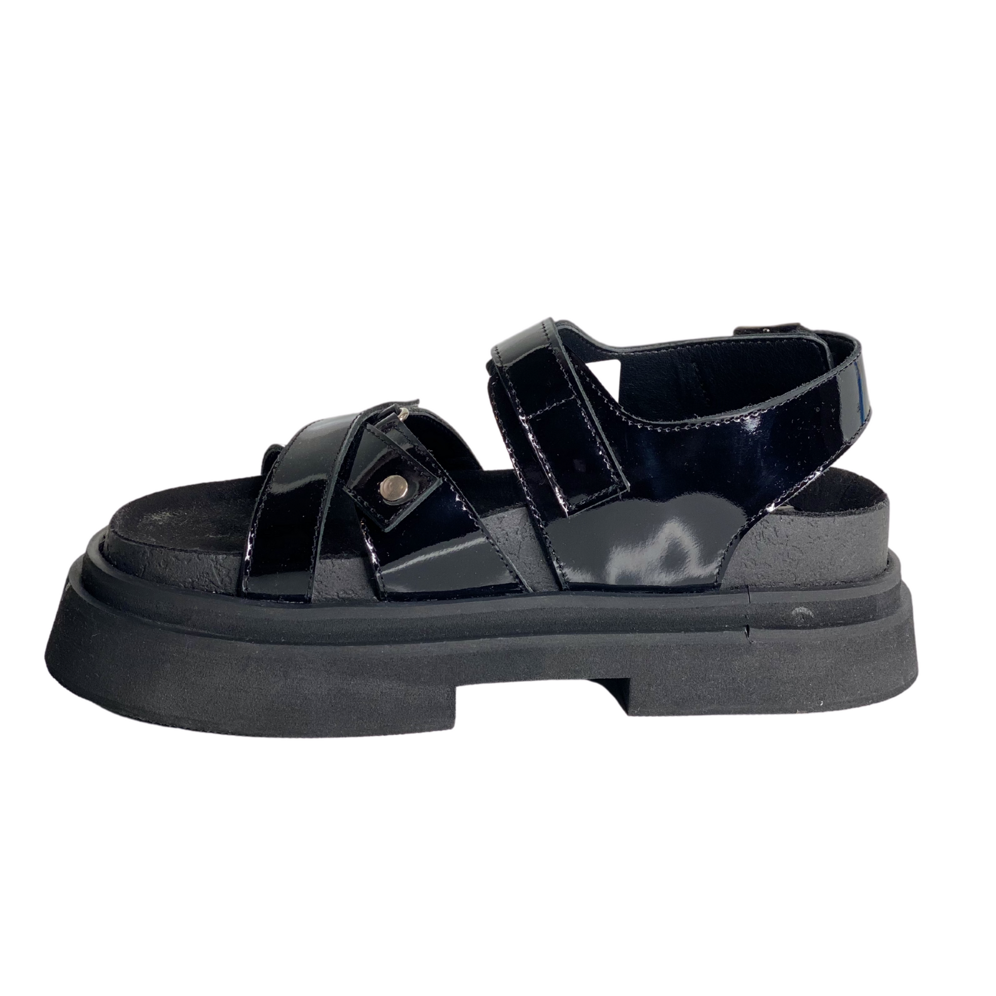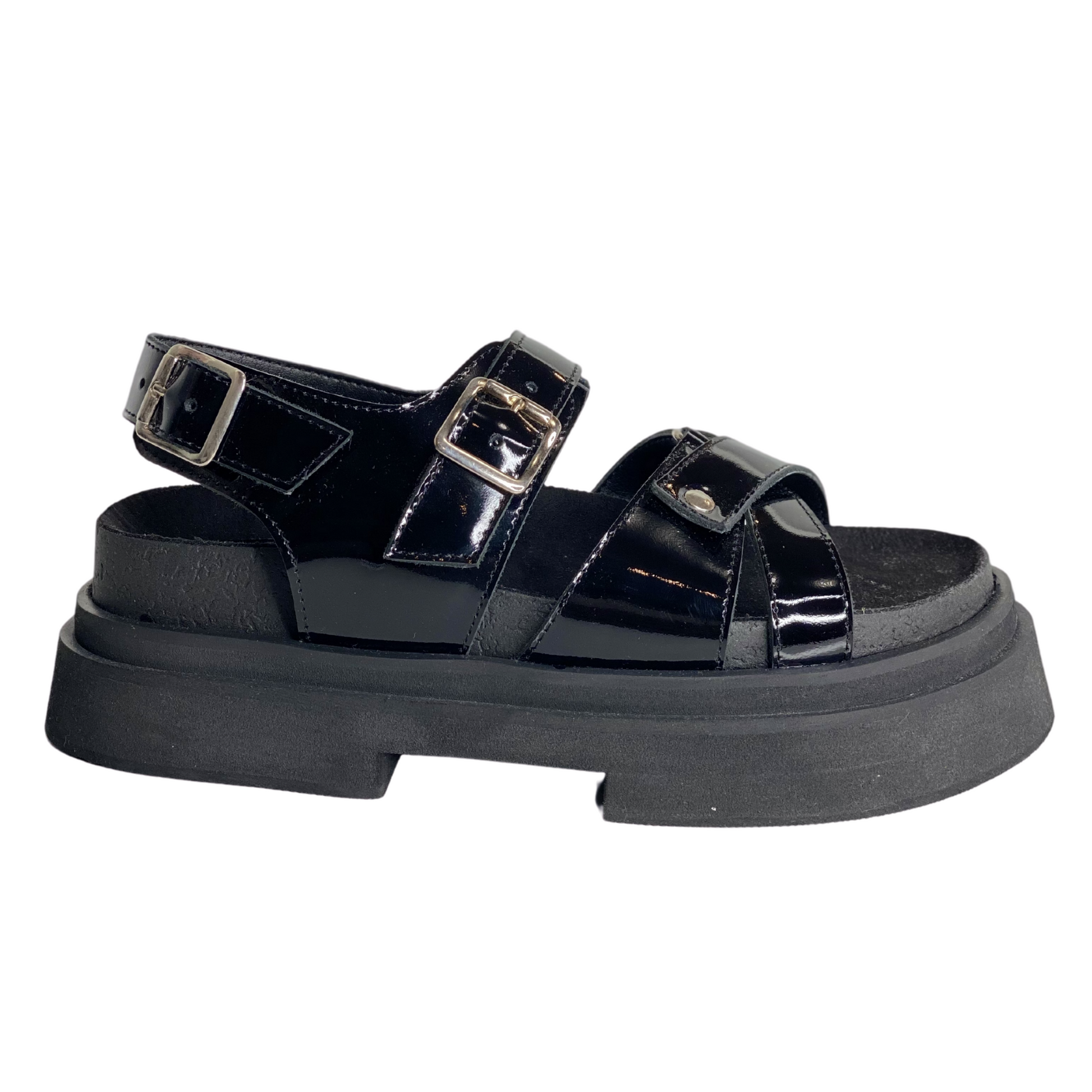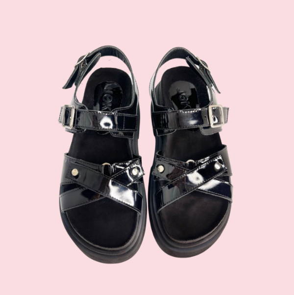 The Bowie black platform sandals are perfect for summer. Featuring glossy patent Genuine leather straps with adjustable buckles, they offer a chic and comfortable fit. The chunky sole adds height and style, making them ideal for pairing with casual or dressy outfits. Whether you're heading to a beach party or a city stroll, these sandals provide a bold and fashionable look.