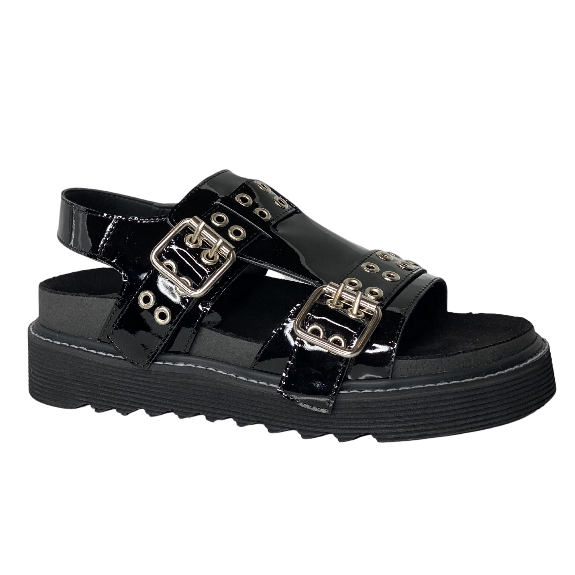 The Cartagena, our vegan patent-leather made sandals that go with everything! Studs and buckles add to the overtone of your outfit. The ankle strap will bring you the support and strength you need to get on with your day.