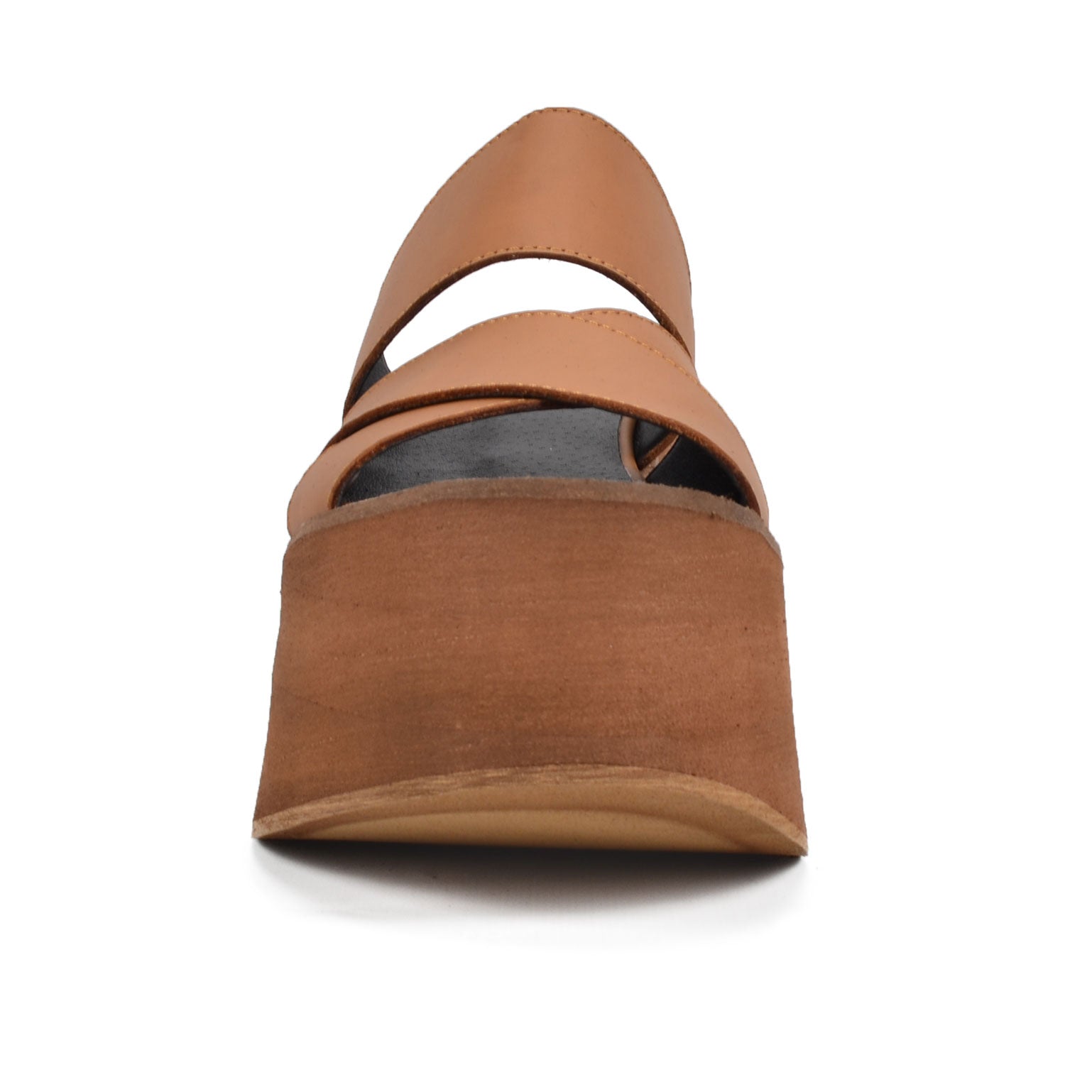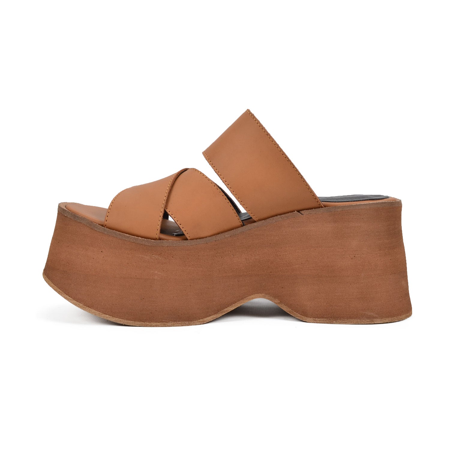 Step into new heights with these chic Genuine Leather,platform sandals, blending vintage charm and modern style. Crafted from quality caramel vegan Argentinian leather. The bold wooden-look platform adds height and evokes retro beachside vibes (and it's made from our uniquely light foam material, so don't worry, they are "JOKU light"). Perfect with maxi dresses or shorts, these sandals promise effortless elegance for every sunlit adventure.