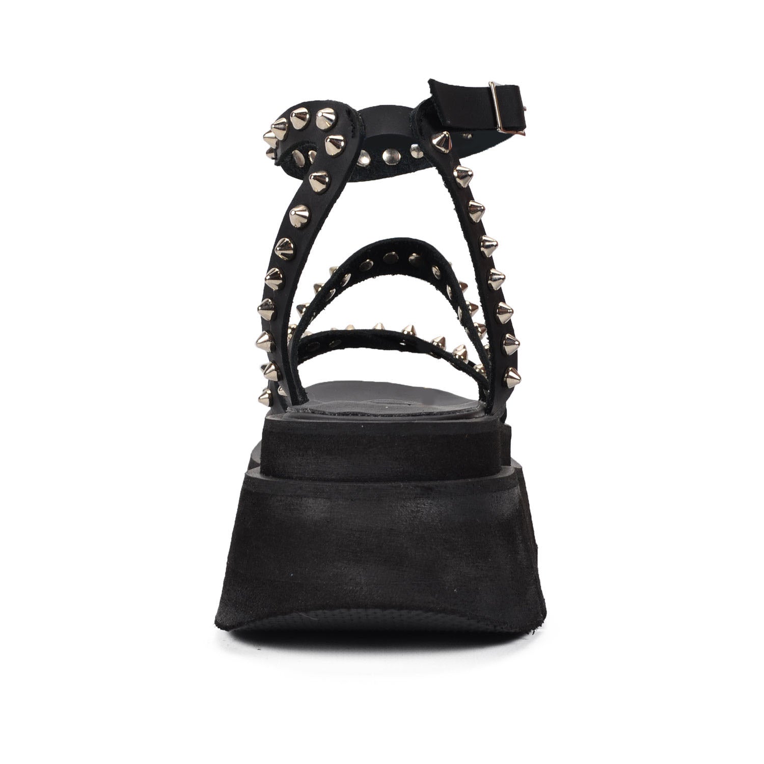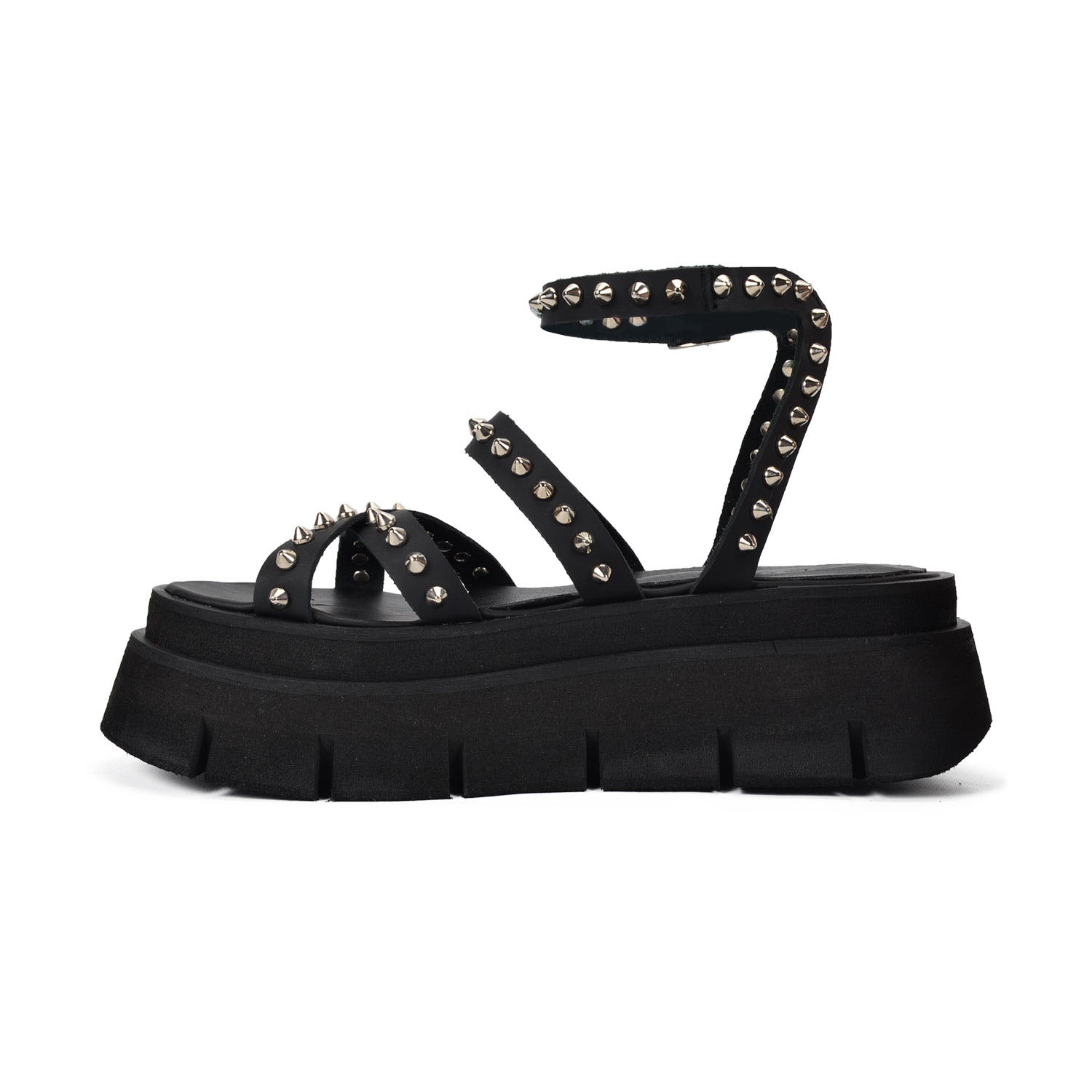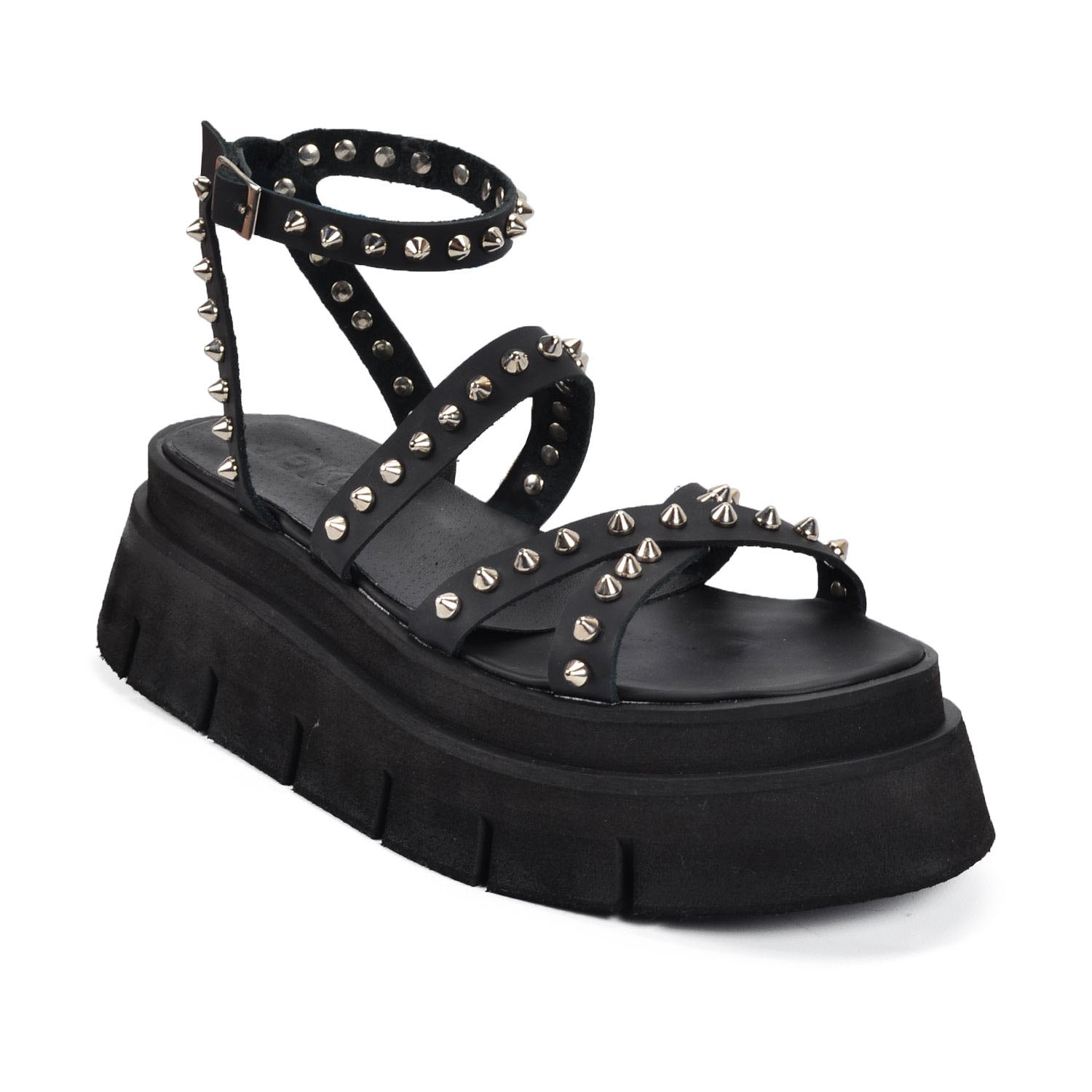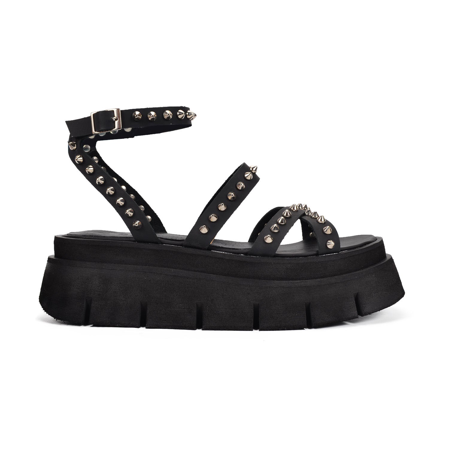 "Costa Rica" the ultimate statement strap Genuine Leather,sandals for your summer collection. These black platform sandals feature sleek straps adorned with edgy silver studs and a secure buckle. Our uniquely light chunky sole adds height and attitude, perfect for pairing with your favorite summer outfits for a bold, fashionable look.