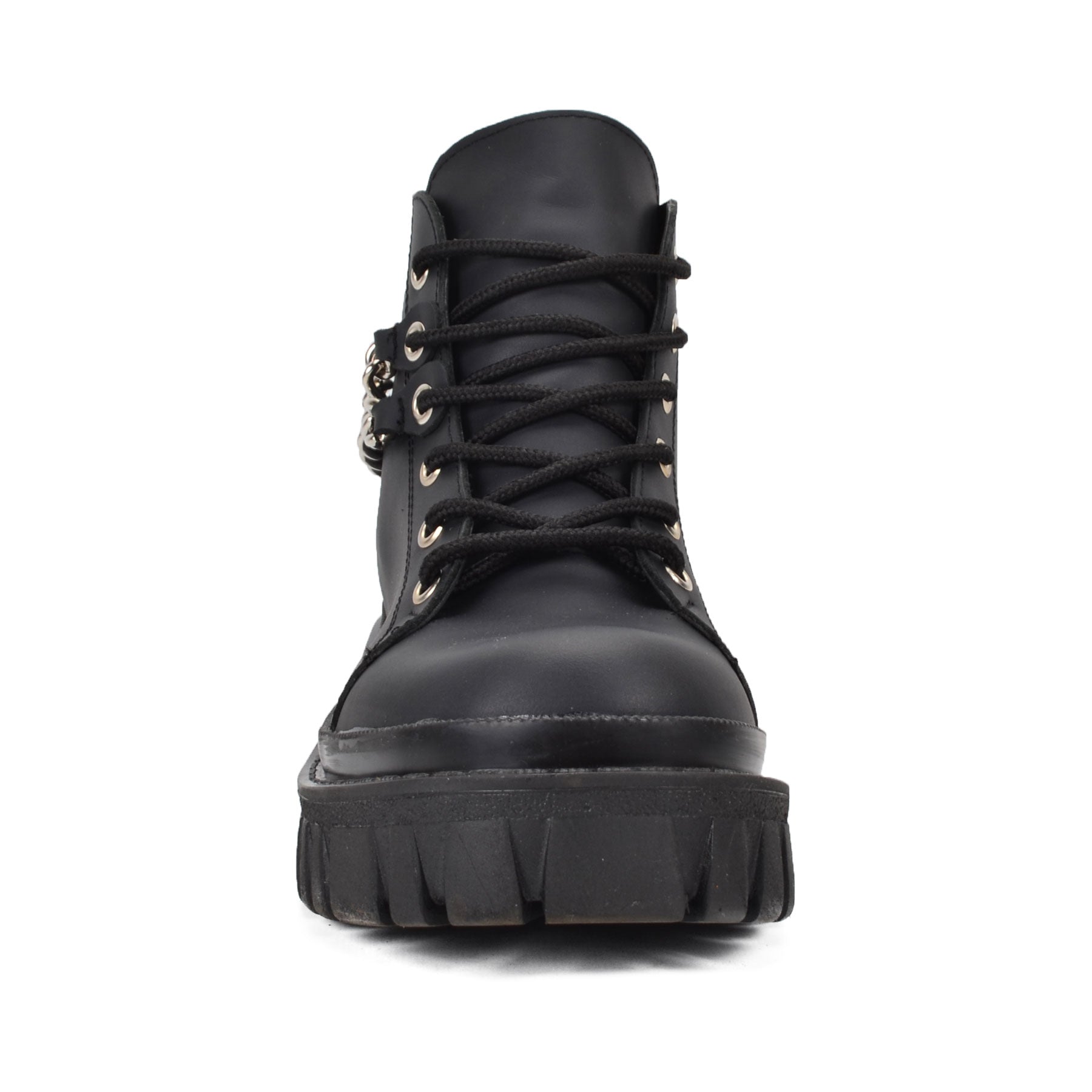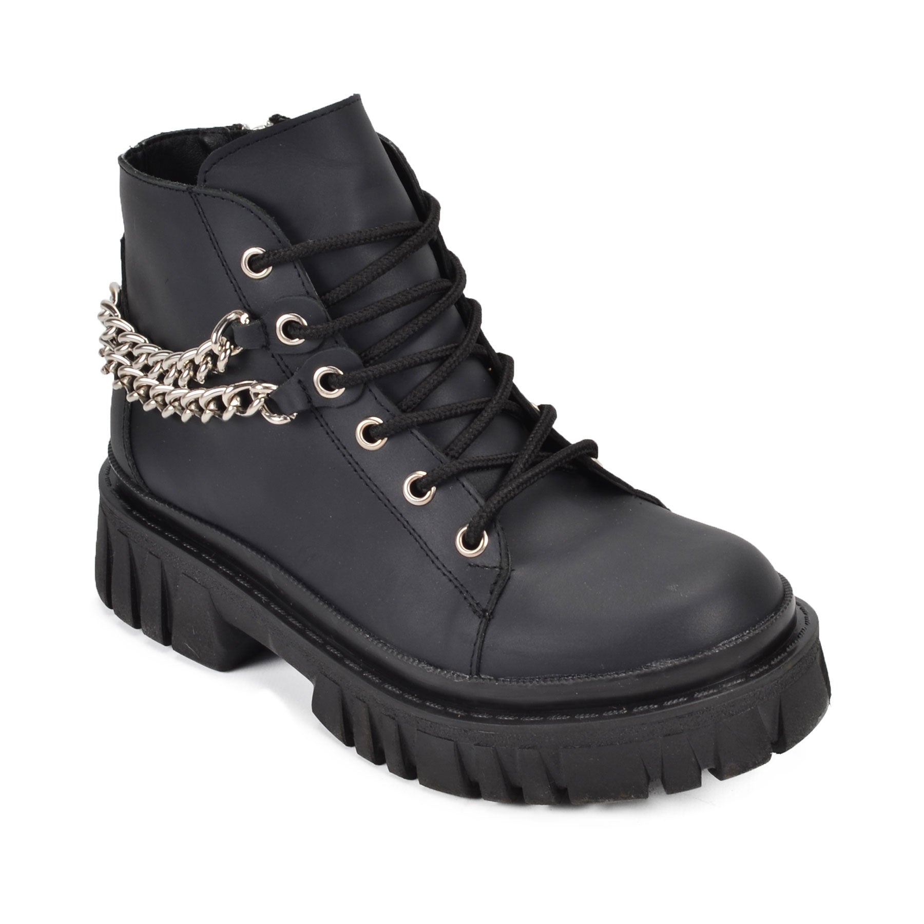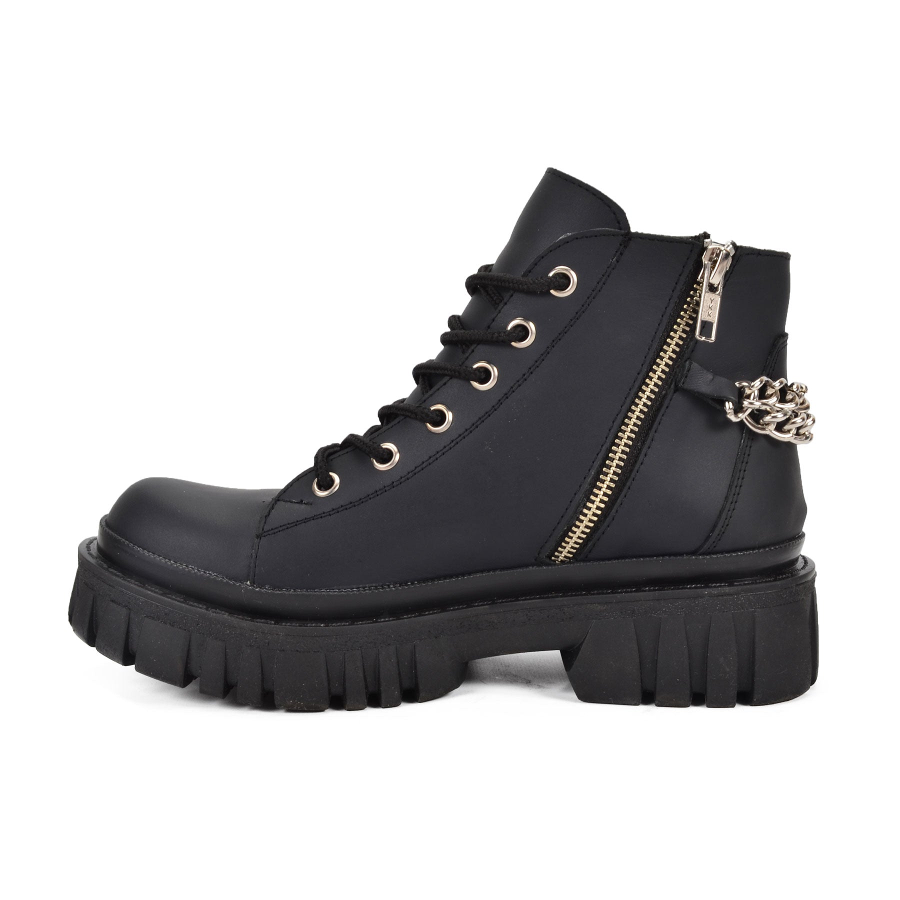 The Guld black ankle boots are a bold and edgy addition to your wardrobe. Made from high-quality matte Genuine Leather, they feature a lace-up design with gold eyelets and an eye-catching chain detail wrapped around the ankle. The light, chunky, lugged sole adds both height and a rugged style, making them perfect for pairing with shorts, skirts, festival outfit or dresses. These boots are ideal for adding a touch of rock-chic to your summer outfits while ensuring comfort and durability.