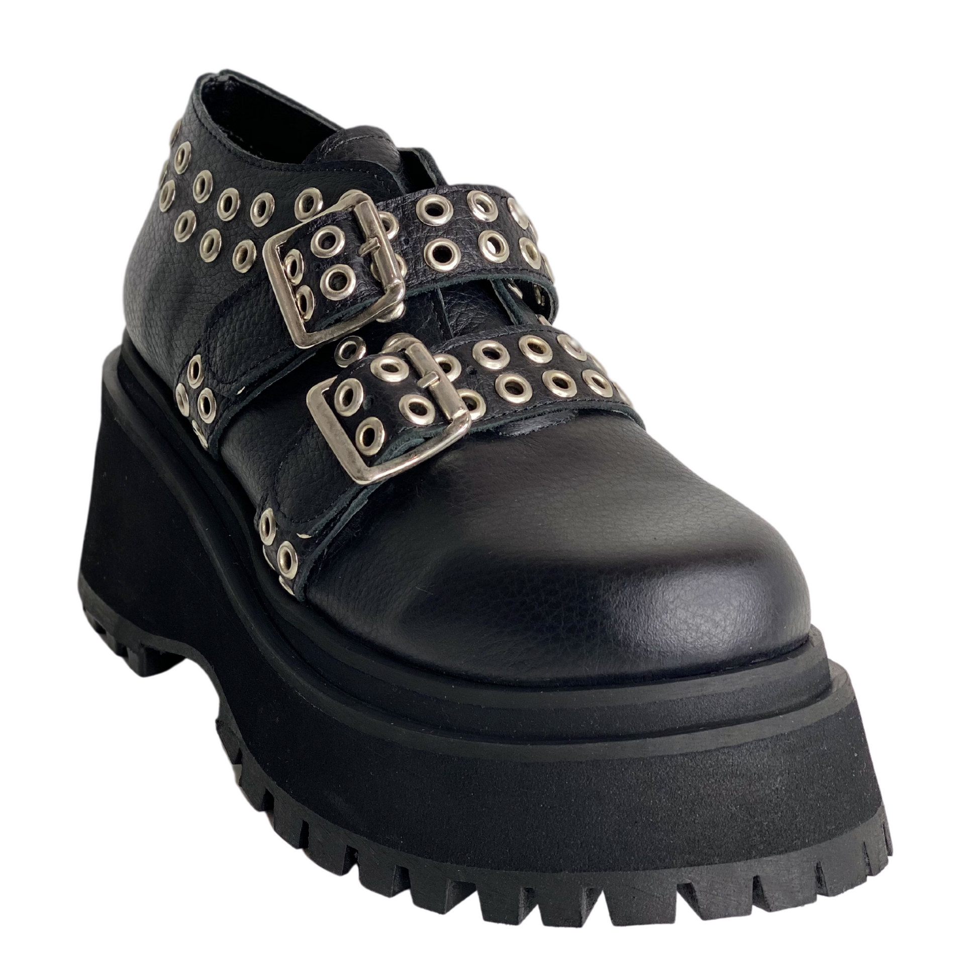 The Liam black platform shoes are a perfect blend of edgy and chic for spring-summer, or fall-winter. Made from textured Genuine Leather they feature double buckle straps adorned with metallic eyelets, adding a bold, industrial touch. Beloved for the back-to-school days! since our uniquely light chunky platform sole provides both height and comfort, ensuring you can wear them all day. Pair these statement shoes with casual outfits, dresses, or skirts to add a distinctive, fashionable edge to your wardrobe.