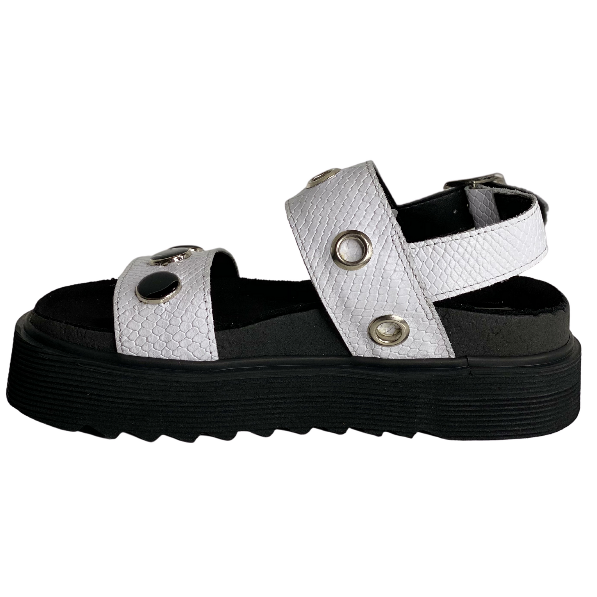 The Luba Black & White Genuine Leather platform sandals are a standout choice for summer. Crafted from textured leather, they feature bold metallic eyelets and an adjustable buckle strap for a secure fit. The chunky black platform sole adds both height and comfort, making them perfect for all-day wear. Pair these edgy yet stylish sandals with casual outfits or summer dresses to add a touch of modern flair to your warm-weather wardrobe.