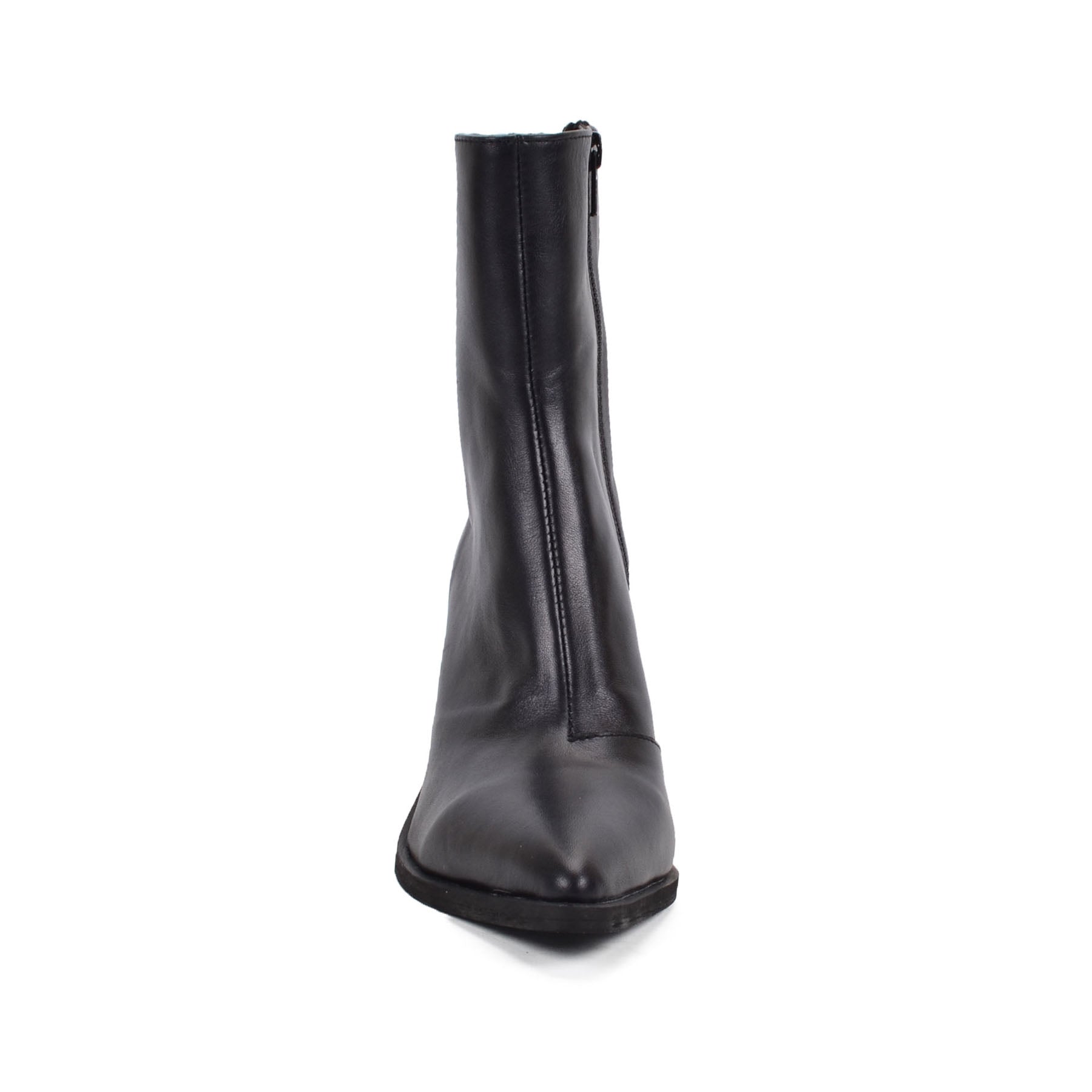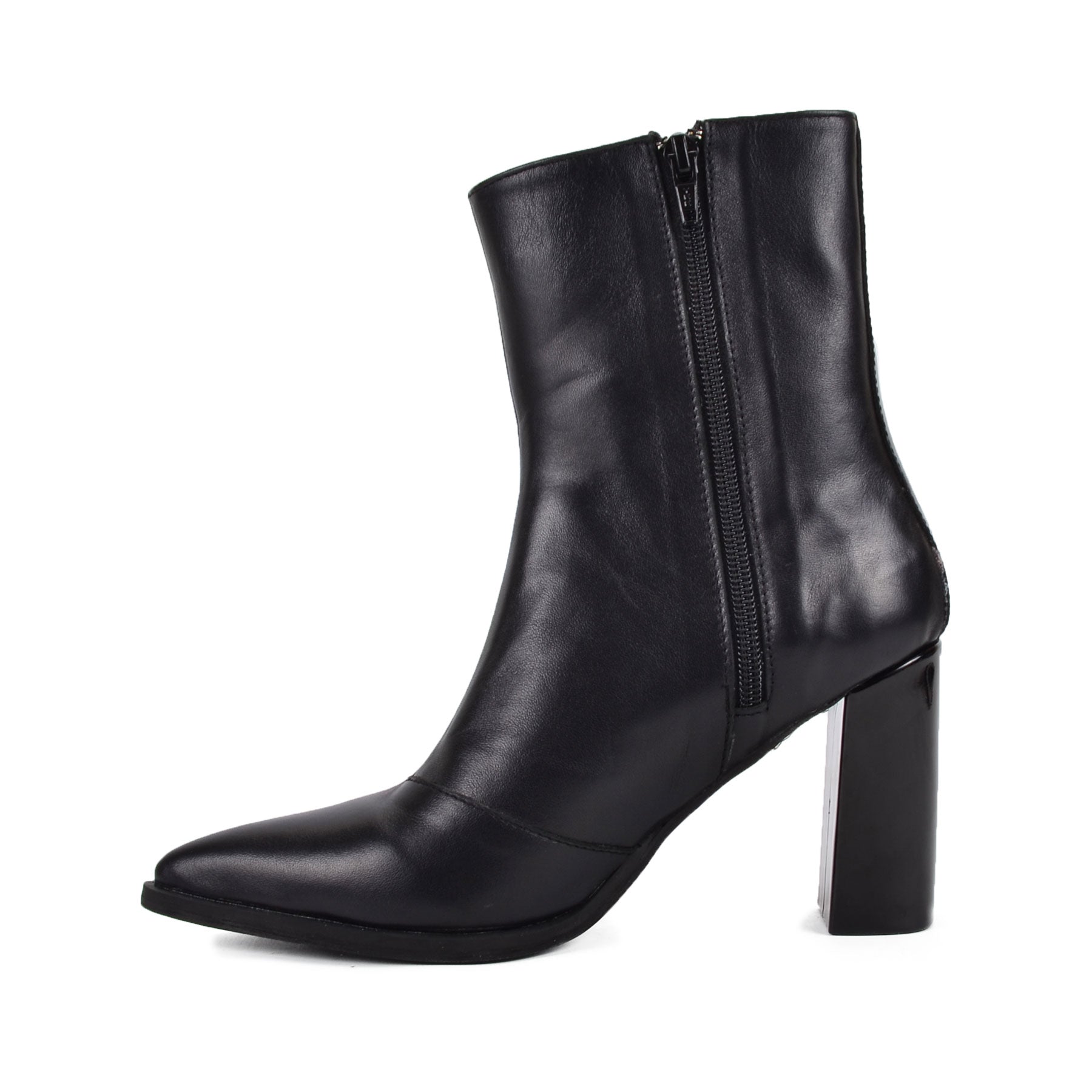 The Mars black Genuine Leather ankle boots feature a smooth finish and a sturdy block heel, perfect for summer evenings. The minimalist design with a pointed toe adds a touch of elegance, making them versatile for pairing with dresses or tailored shorts for a chic, modern look. Ideal for adding sophistication to any outfit. A total Fall and Spring Favorite!