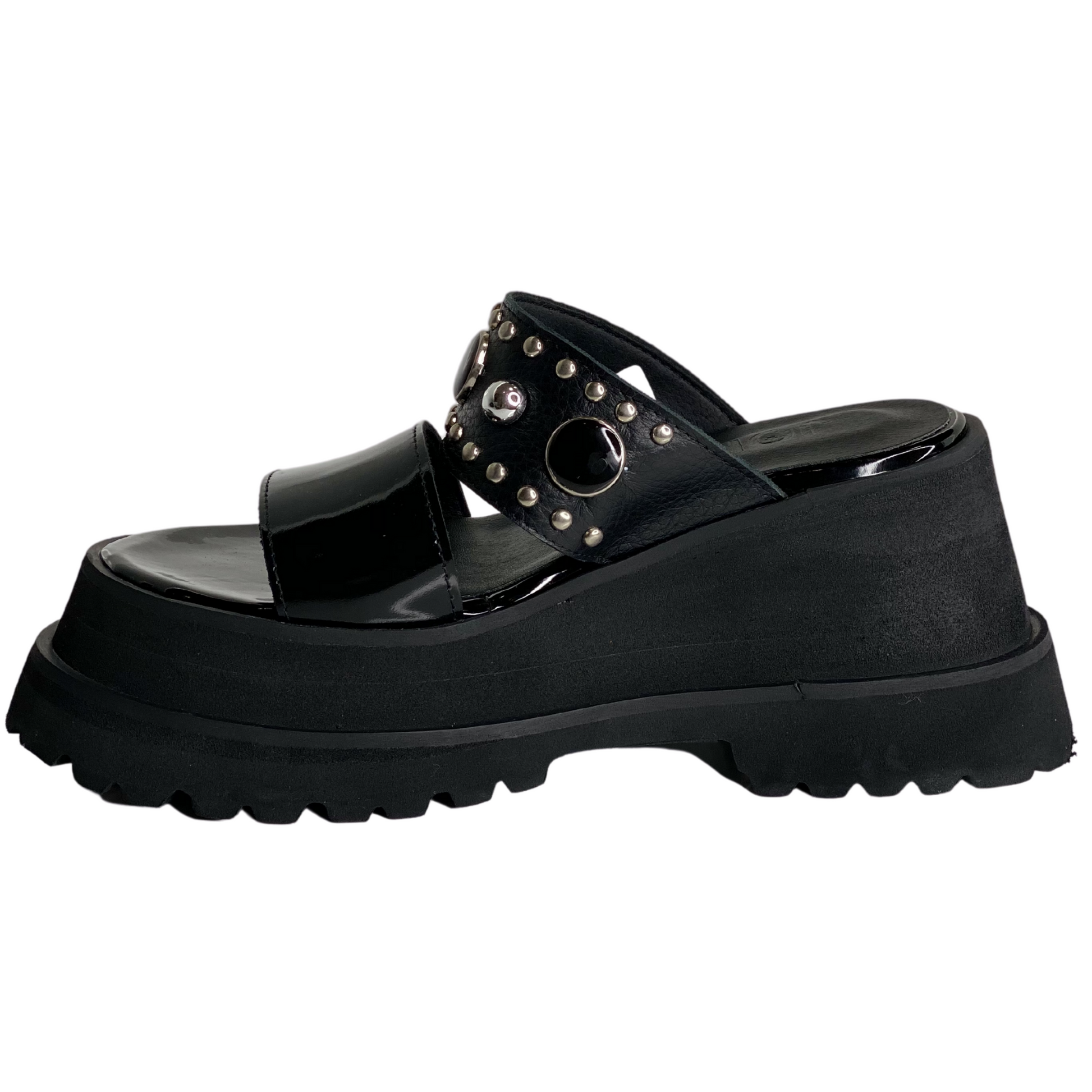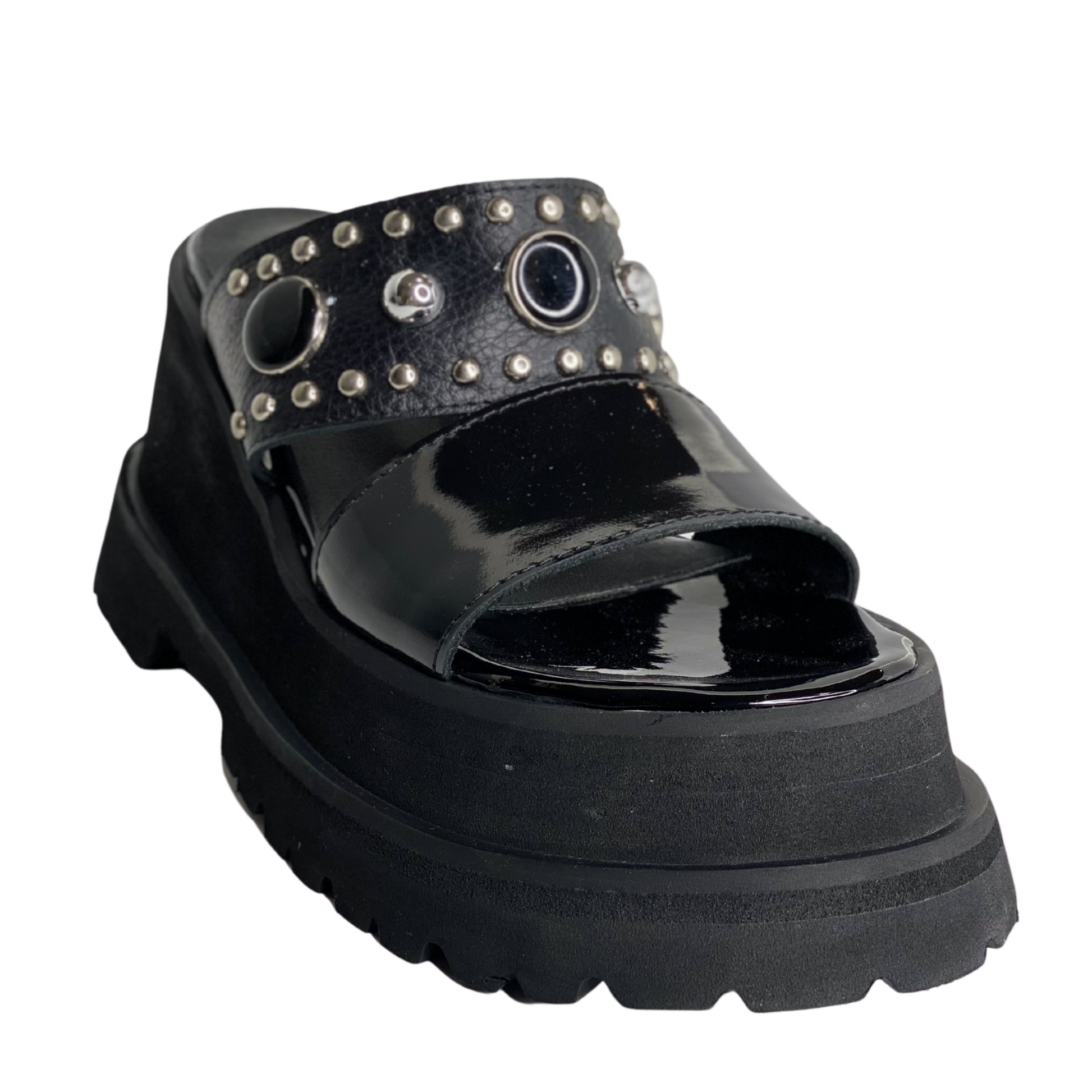 Rega, the ultimate Genuine Leather platform sandals for a bold and stylish summer look. These eye-catching black sandals feature a combination of glossy and textured wide straps, embellished with large silver studs and grommets for a touch of edgy glamour. The chunky platform sole provides height and all-day comfort, making them perfect for long summer days and nights. Pair Rega with your favorite summer dresses or casual outfits to effortlessly elevate your style and make a statement wherever you go.
