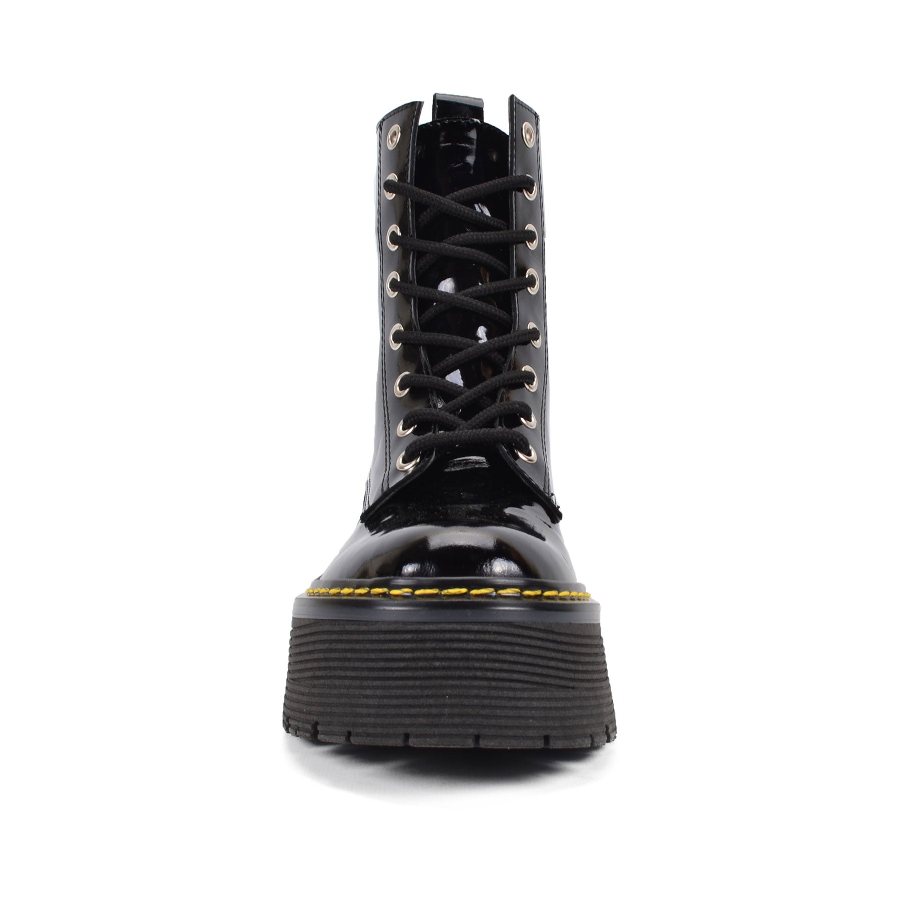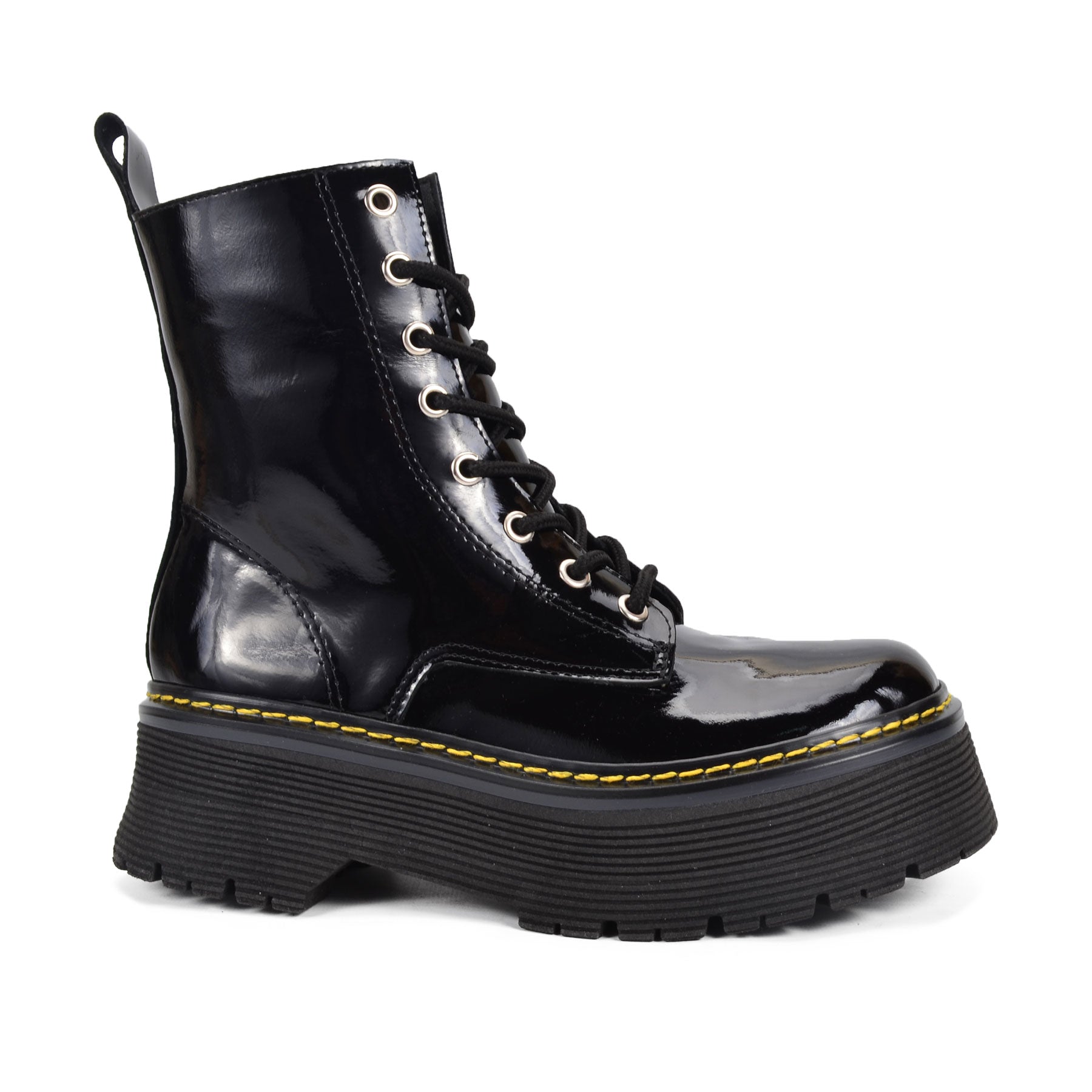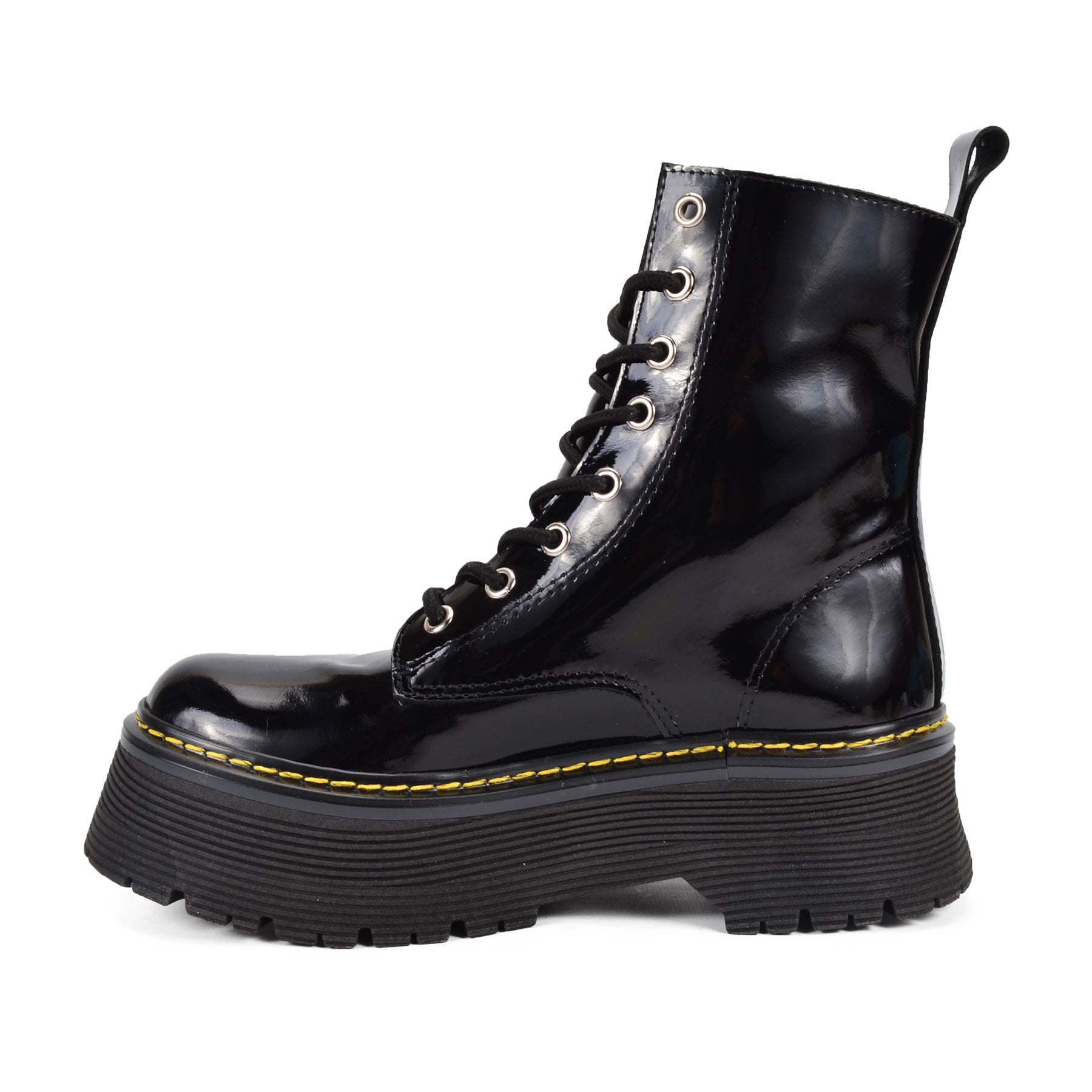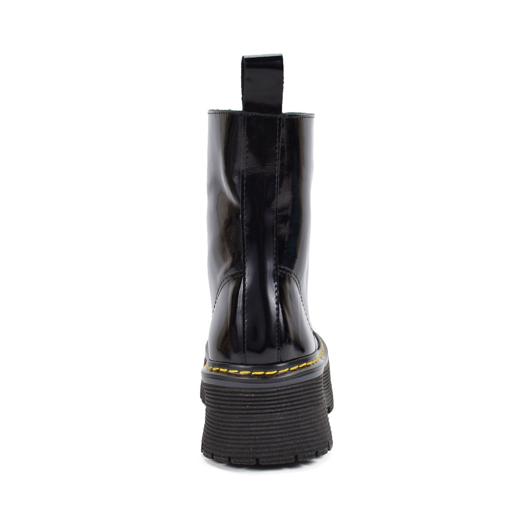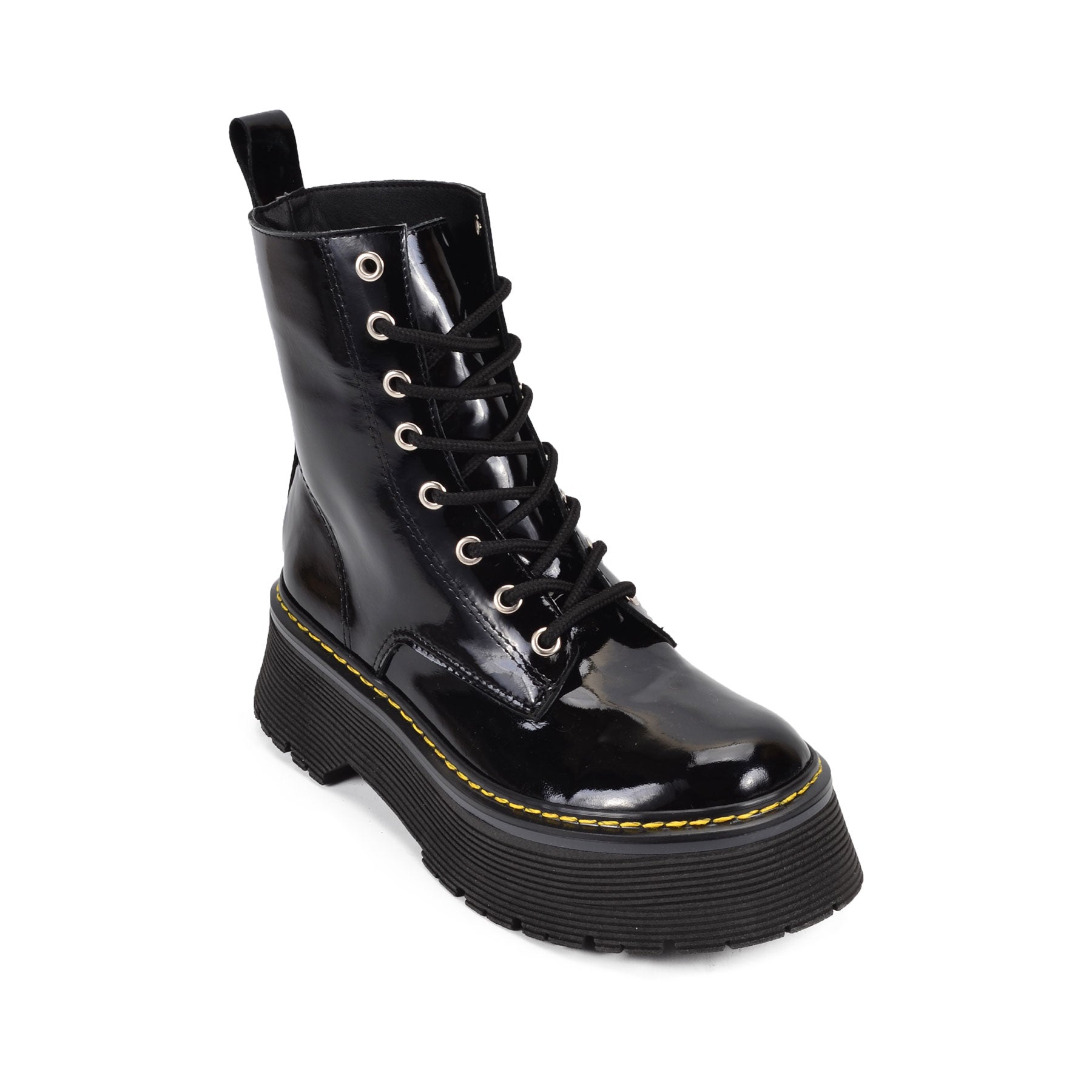 The Rock black vegan leather combat boots are perfect for adding an edgy touch to your festival wardrobe. Featuring a glossy crocodile-textured finish and chunky platform sole, they combine bold style with comfort. The lace-up design with metal eyelets offers a secure fit, while the yellow stitching adds a pop of color. Pair these boots with a flowy dress or denim shorts for a striking contrast, making them ideal for festivals, concerts, or any casual summer outing where you want to stand out while staying cruelty-free. They are simply the perfect lace-up to wear year round!
