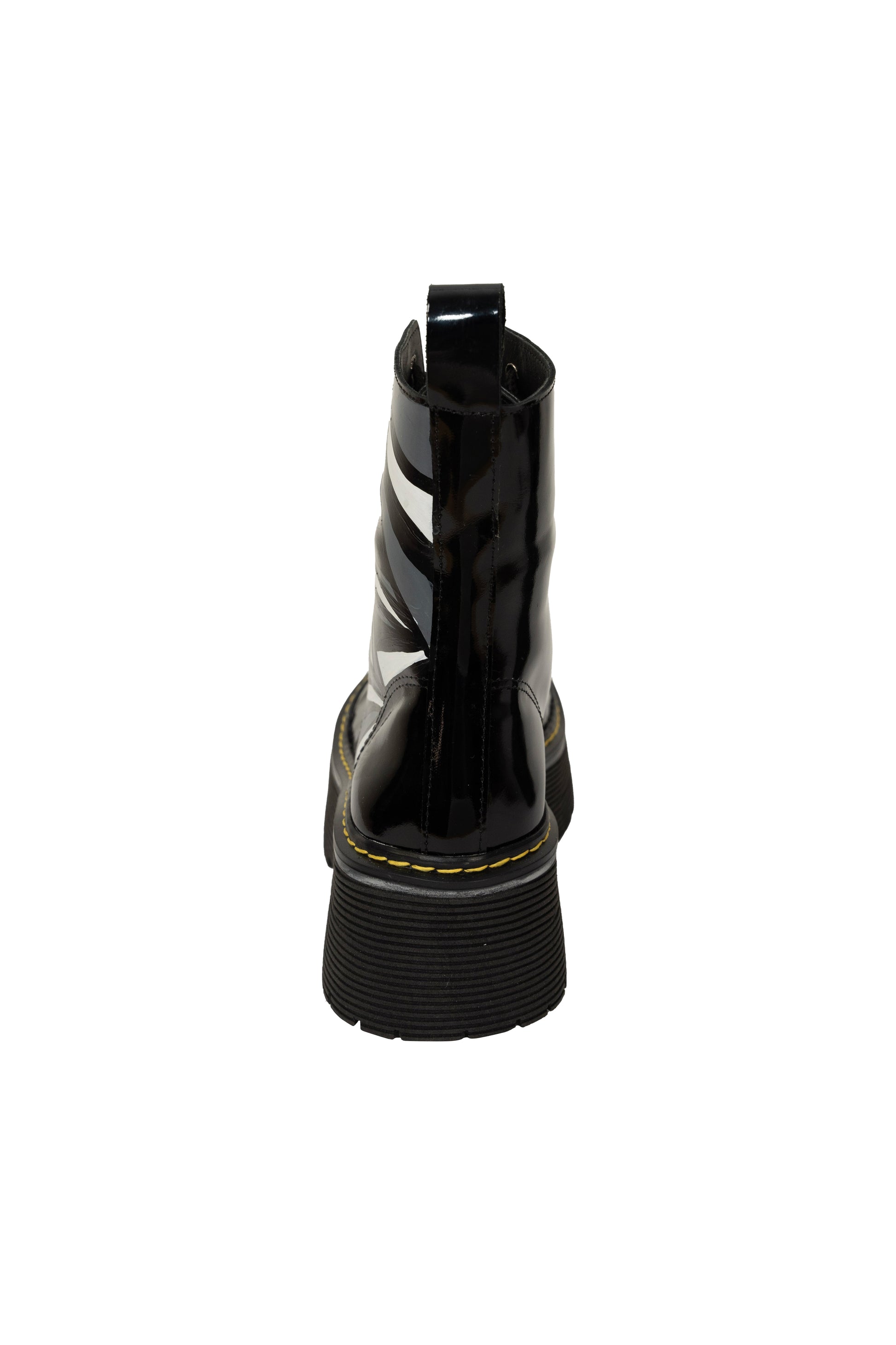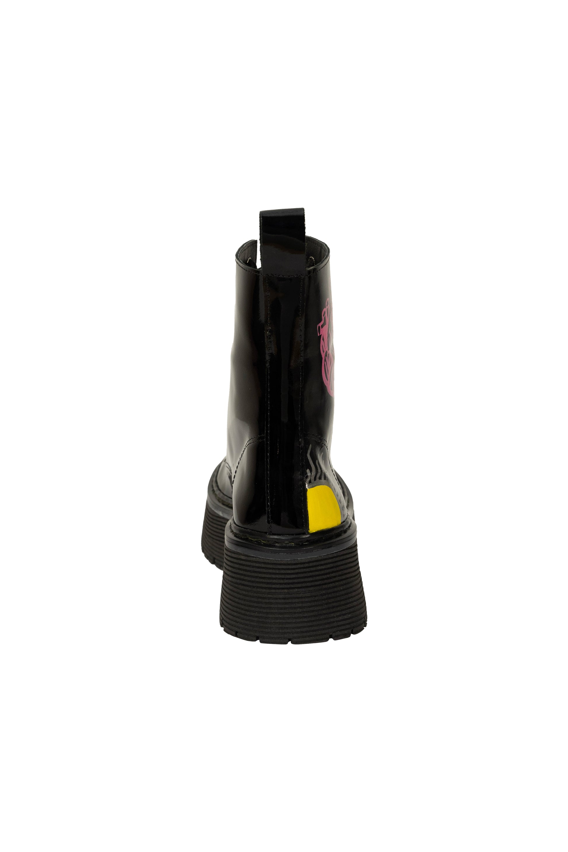 The Rock black vegan leather combat boots are perfect for adding an edgy touch to your festival wardrobe. Featuring a glossy crocodile-textured finish and chunky platform sole, they combine bold style with comfort. The lace-up design with metal eyelets offers a secure fit, while the yellow stitching adds a pop of color. Pair these boots with a flowy dress or denim shorts for a striking contrast, making them ideal for festivals, concerts, or any casual summer outing where you want to stand out while staying cruelty-free. They are simply the perfect lace-up to wear year round!