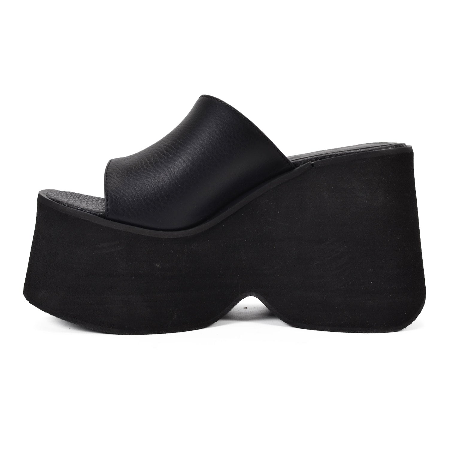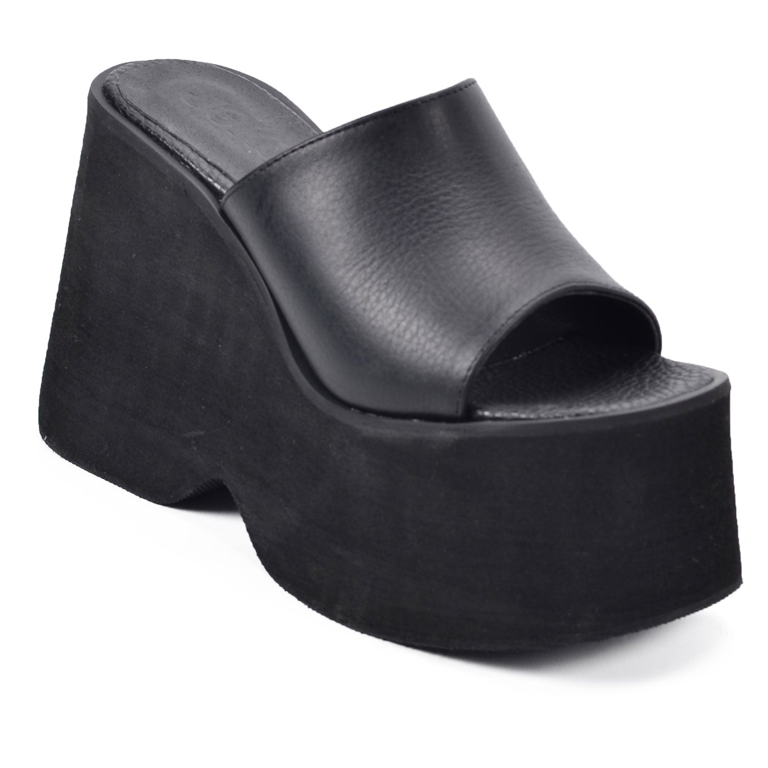 Samoa, the perfect Genuine Leather platform slides for a stylish and comfortable summer. These black sandals feature a minimalist design with a wide, textured strap and a unique, sculpted ultra-light mega platform sole that offers both height and stability. The cushioned footbed ensures all-day comfort, making them ideal for casual outings and beach days. Elevate your summer wardrobe with the effortlessly chic and versatile Samoa slides.