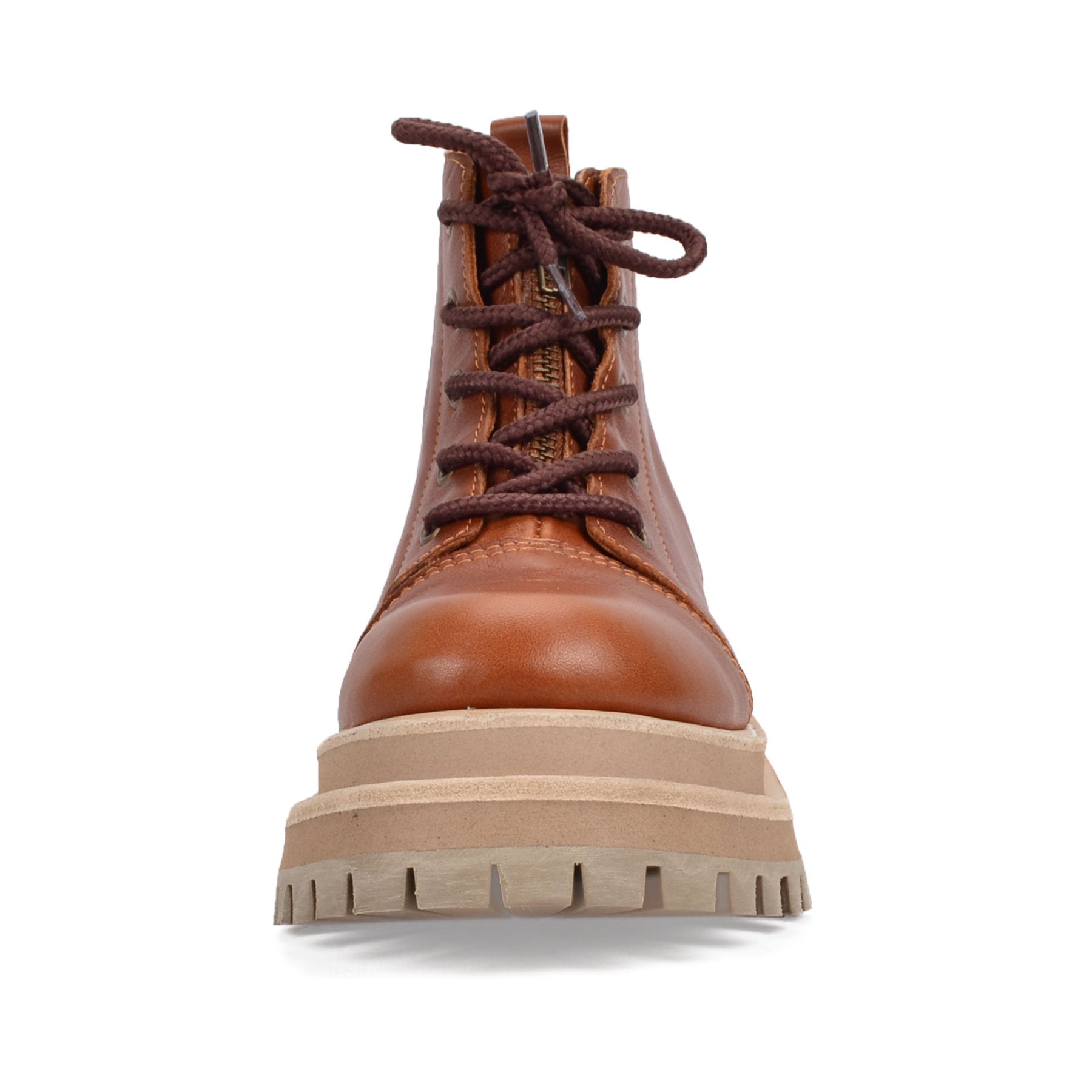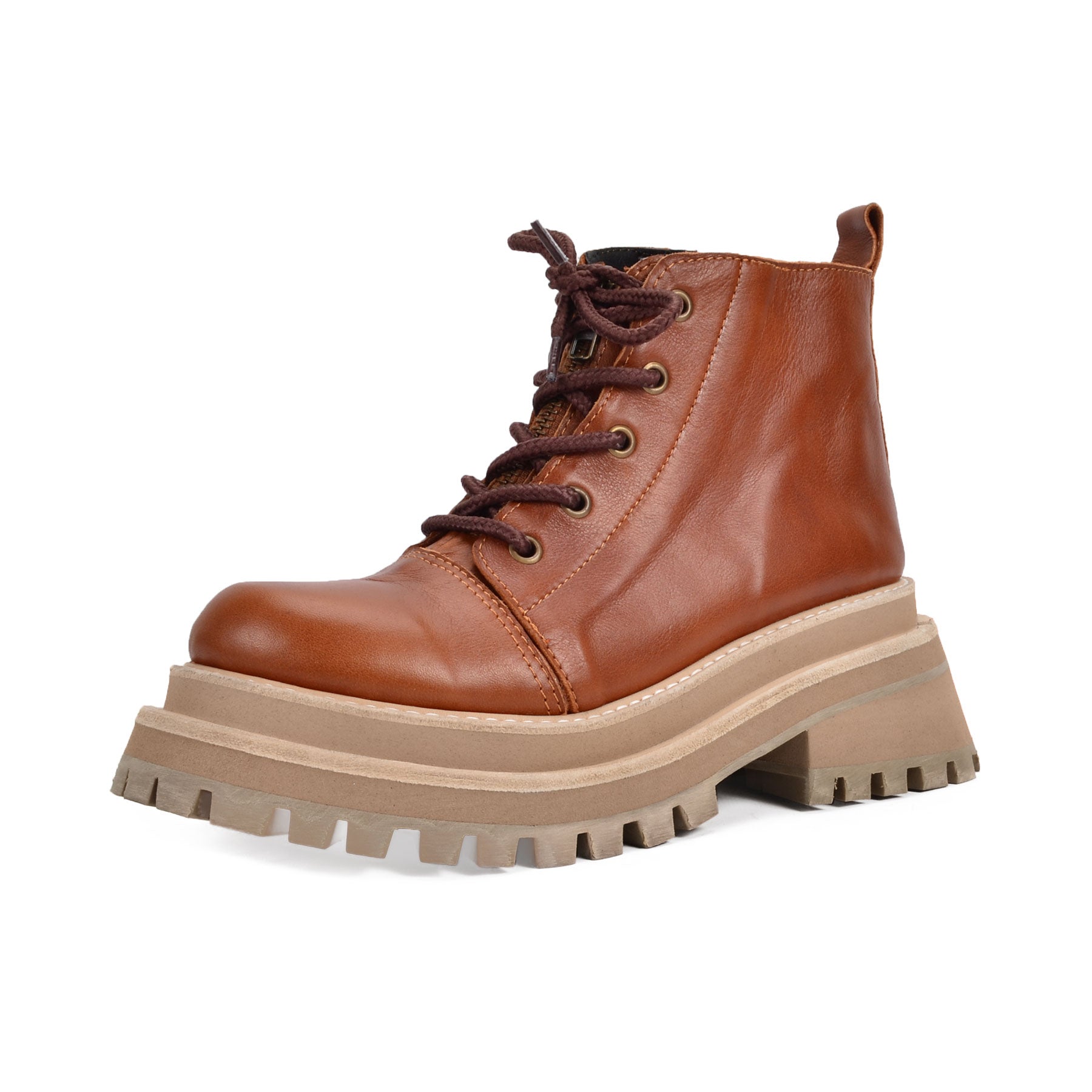SATO TAN, the perfect boots for adding a touch of rugged charm to your wardrobe. These tan Genuine Leather boots feature a stylish lace-up design with antique brass eyelets, ensuring a secure fit and a vintage-inspired look. The standout chunky sole in a contrasting beige provides both height and comfort, making them ideal for long days of exploring or casual outings. Pair SATO TAN with dresses, skirts, or jeans for a versatile and fashionable ensemble, and pack them for your festival trips. Embrace the season with the timeless style and durability of SATO TAN boots.