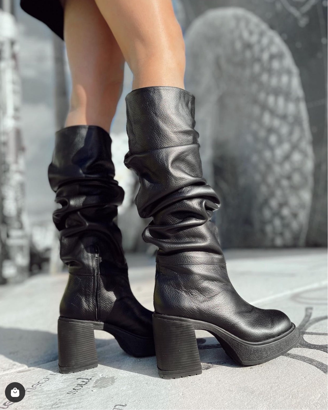 Step into bold style with the "Scott Chunky Boots". These Genuine Leather black, knee-high boots feature a luxurious, slouched design that exudes effortless chic. The chunky high heel adds height and drama, while the textured leather finish provides a touch of sophistication. Perfect for pairing with mini skirts, dresses, or skinny jeans, the Scott Chunky boots offer a versatile and fashion-forward look. Make a statement and embrace every season with the standout style of Scott Chunky boots.