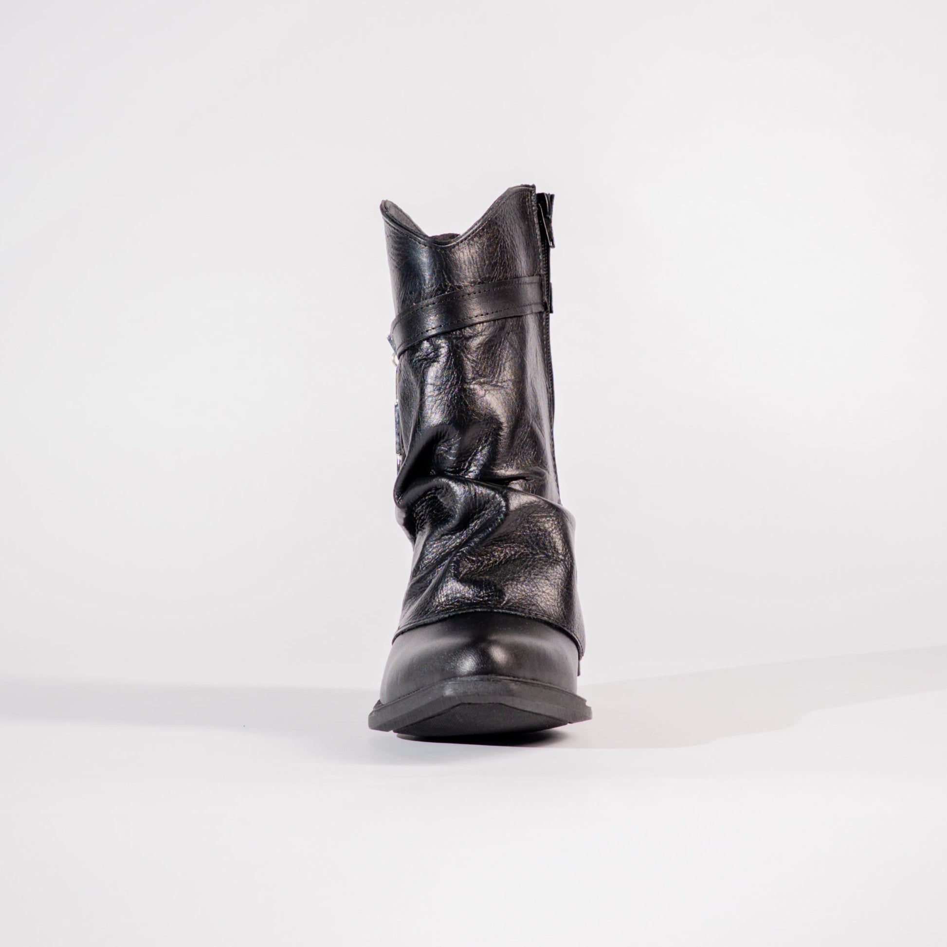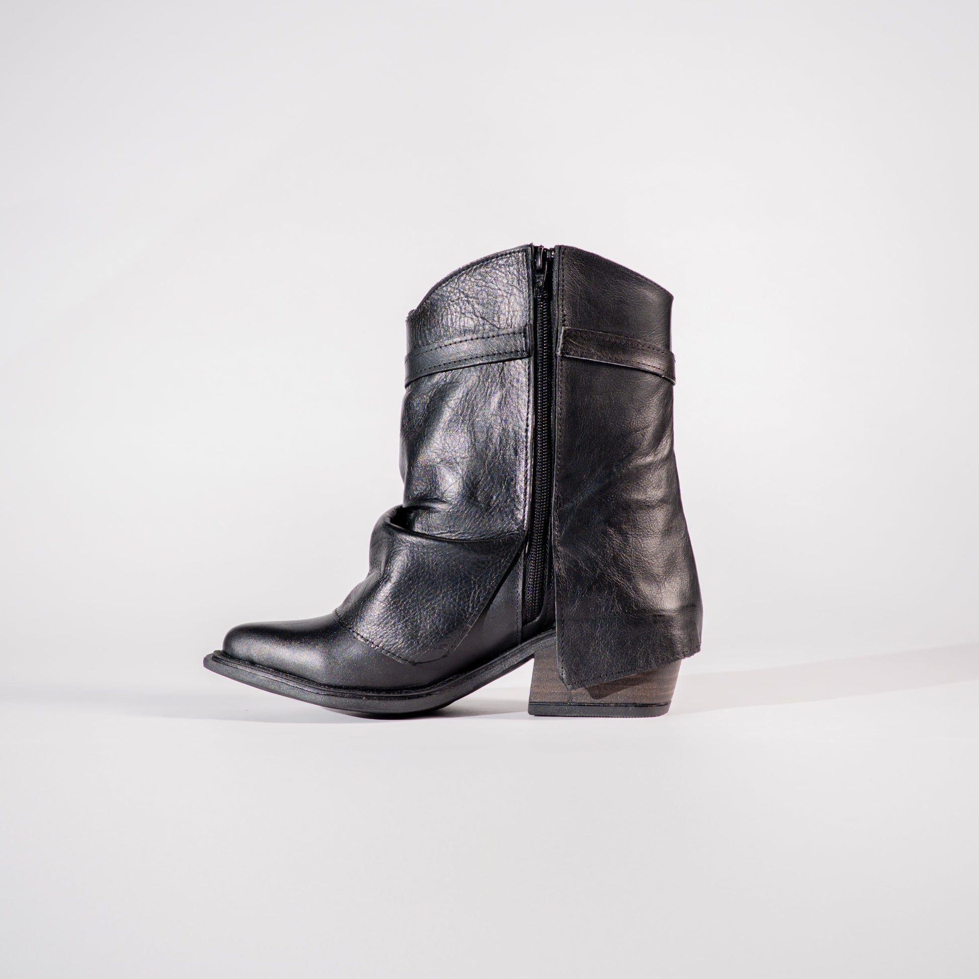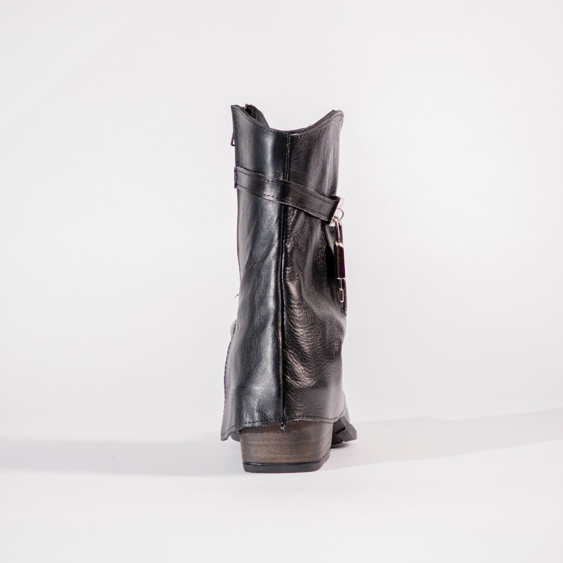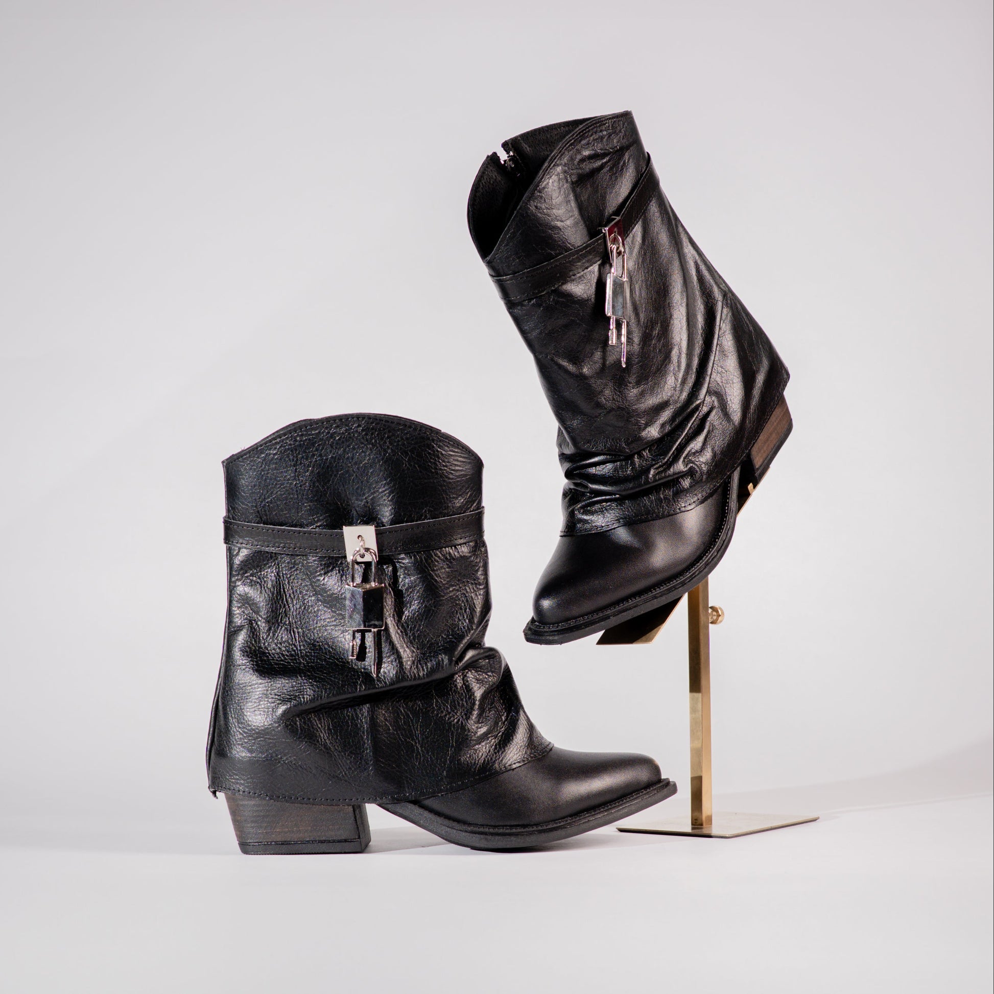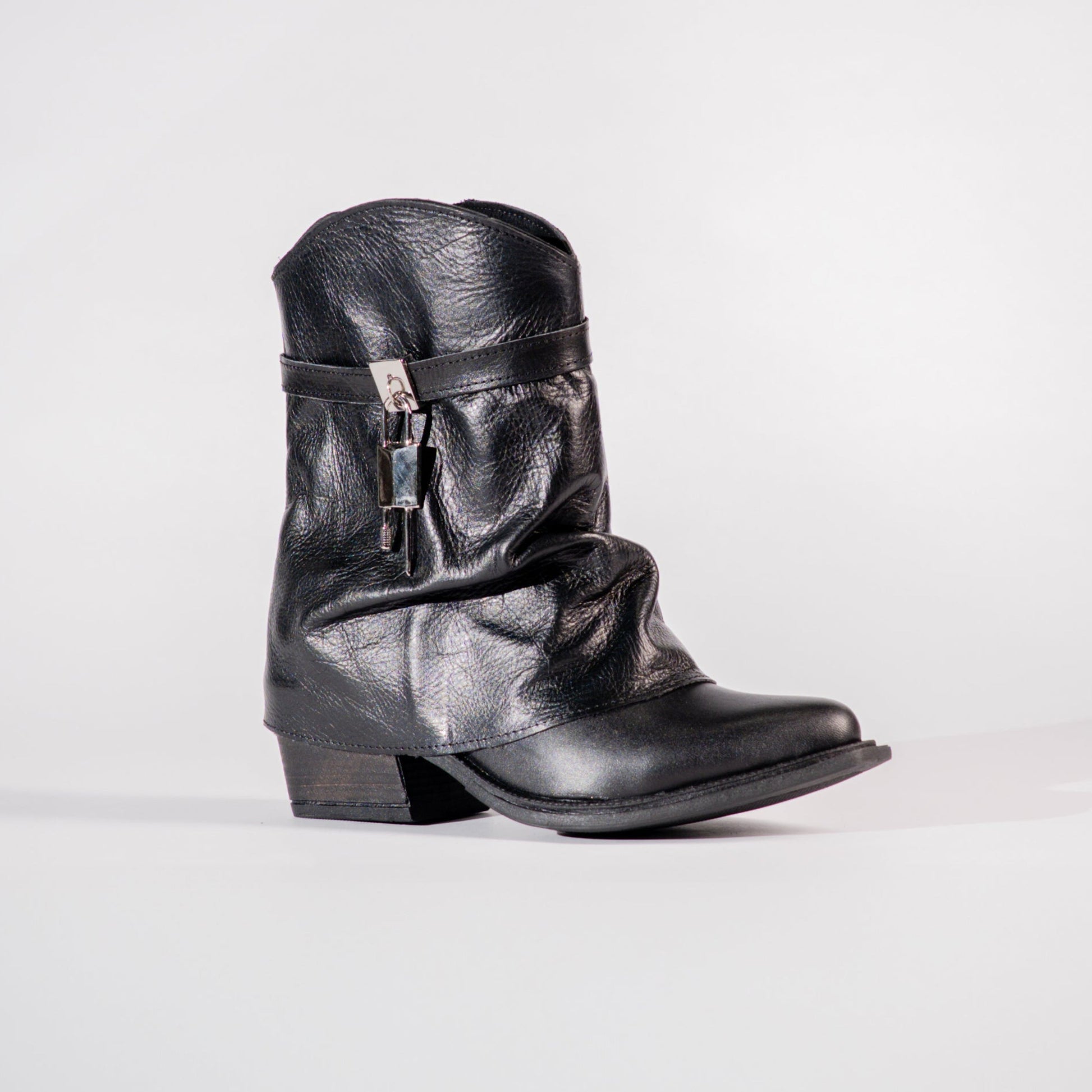Inspired by Selene, goddess of the moon, this short Texana channels quiet power through a relaxed, draped silhouette in soft black leather. The effortless fold gives the boot a natural flow and a touch of mystery, while the signature metal lock charm stands as a symbol of protection, allure, and the strength a woman carries within.
