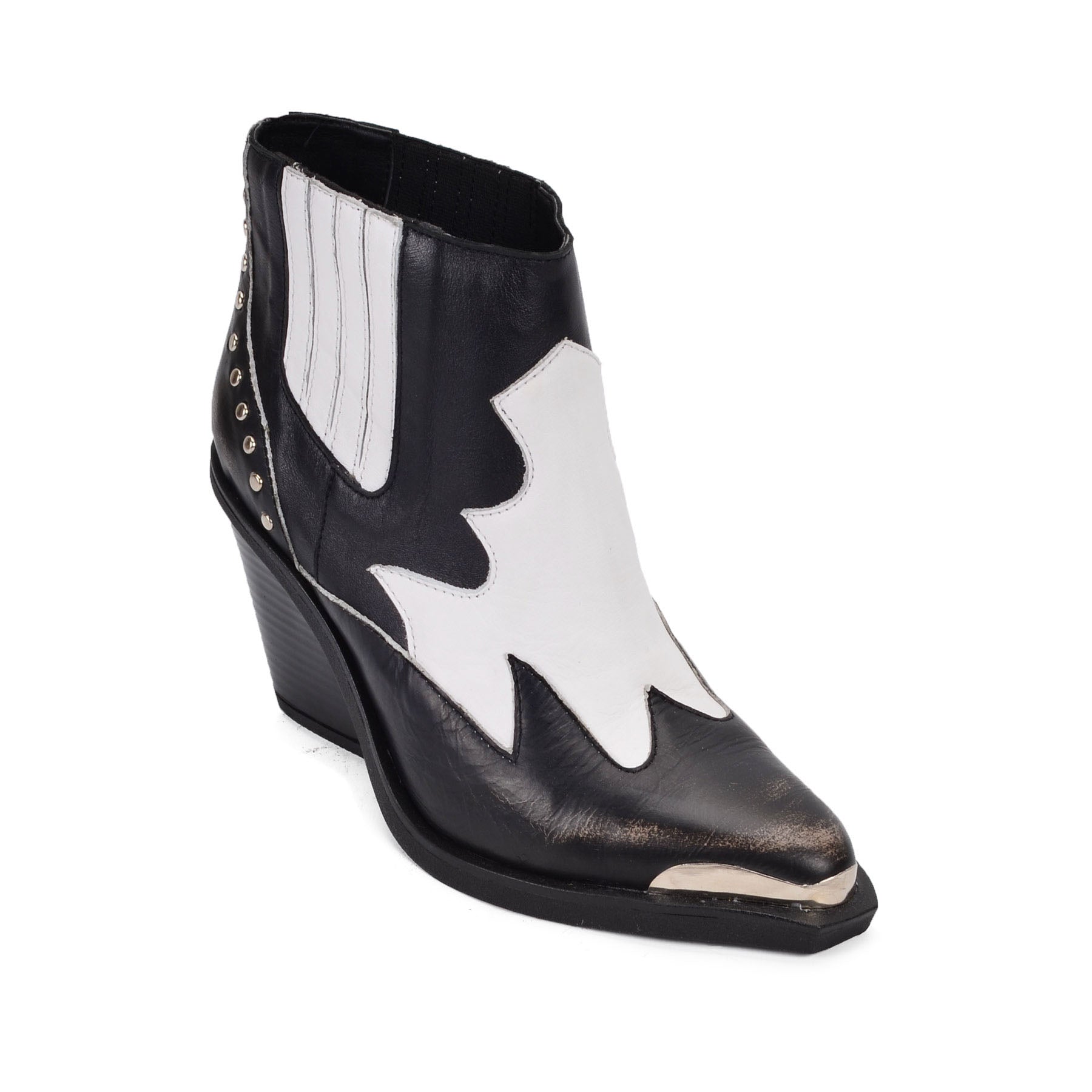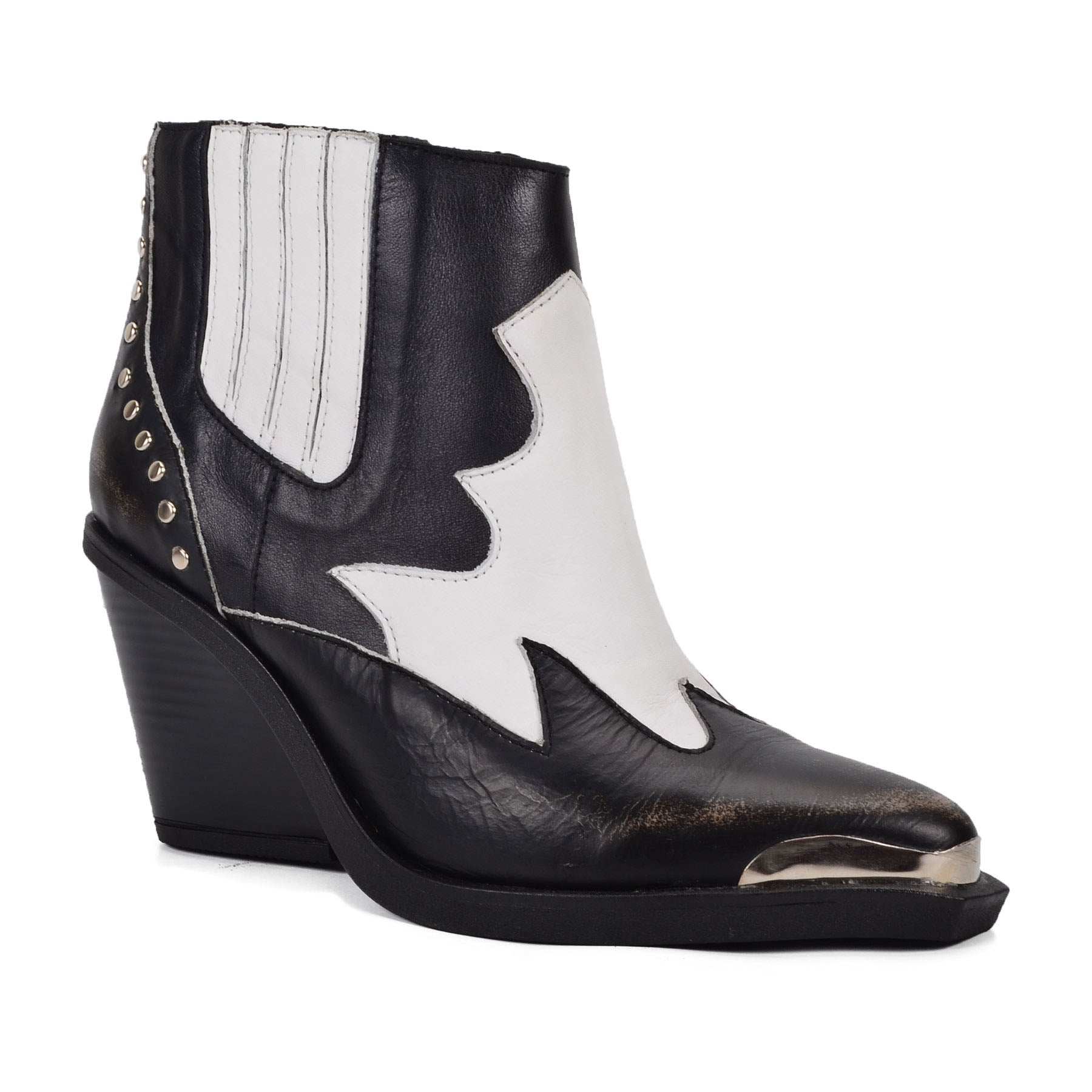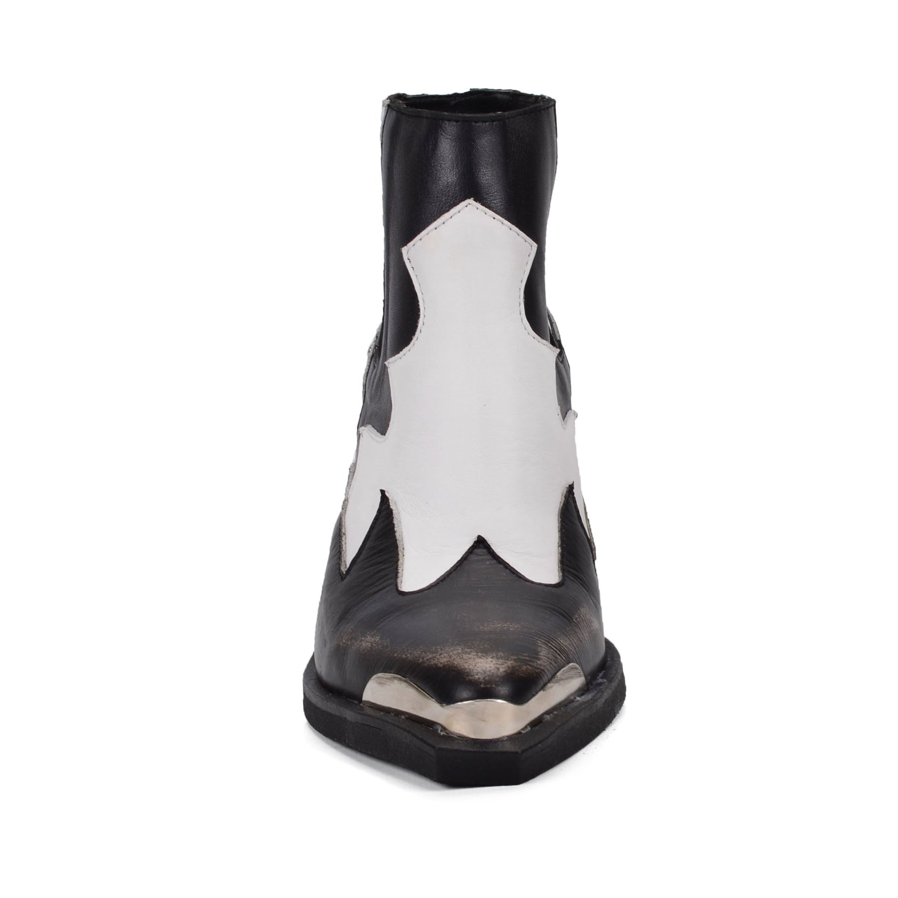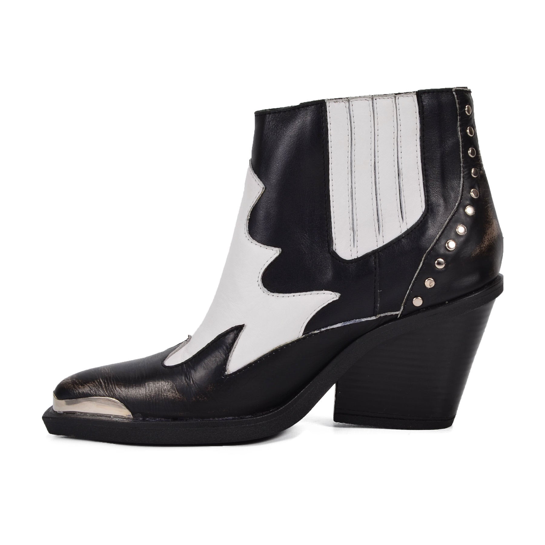 Silver, the standout boots that bring a bold western flair to your summer, fall and spring wardrobe. These Genuine Leather black and white boots feature striking contrast panels and intricate stitching, exuding a unique and stylish vibe. The pointed toe is adorned with a silver cap, adding a touch of metallic edge, while the studded accents on the heel provide an extra layer of detail. The mid-height block heel ensures both comfort and style, making Silver perfect for pairing with dresses, skirts, or jeans. Step out in confidence and make a statement this summer with Silver boots.