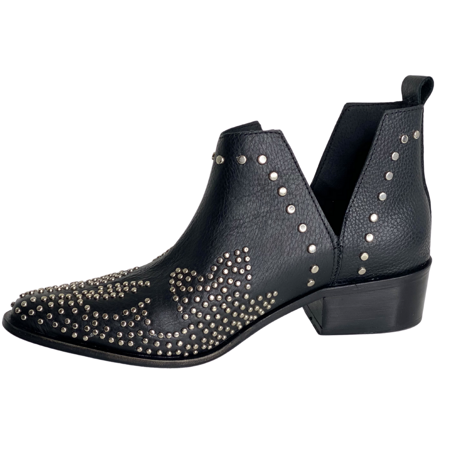 Tao, the perfect blend of western flair and modern edge for your summer footwear collection. These black Genuine Leather ankle boots feature intricate silver stud detailing that creates a striking pattern, adding a touch of elegance to their rugged style. The deep V-cut design and pull tab ensure easy on-and-off wear, while the low block heel provides comfort and stability. Pair Tao with dresses, shorts, or denim for a versatile and chic look that stands out in spring-summer or fall-winter. Embrace the spirit of adventure and style with Tao boots!